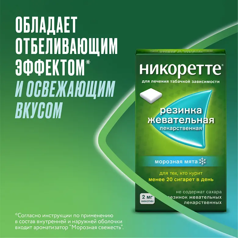 1 резинка жевательная лекарственная содержит: Дозировка 2 мг: Действующее вещество: никотин-полимерный комплекс – 11 мг (указанное количество эквивалентно 2,2 мг никотина, включая 10% избыток). Вспомогательные вещества: Ядро резинки жевательной лекарственной: жевательная резинка (основа)* – 560 мг, ксилитол – 314 мг, мяты перечной масло – 30 мг, натрия карбонат – 20 мг, натрия гидрокарбонат – 10 мг, калия ацесульфам – 2 мг, левоментол – 2 мг, магния оксид – 1 мг; Внутренняя оболочка: ароматизатор «Winterfresh» – 9 мг, гипромеллоза – 7,5 мг, сукралоза – 3,5 мг, полисорбат 80 – 0,5 мг; Наружная оболочка: ксилитол – 277,5 мг, крахмал прежелатинизированный – 6,5 мг, титана диоксид – 6 мг, ароматизатор «Winterfresh» – 5 мг, карнаубский воск – 1 мг. Дозировка 4 мг: Действующее вещество: никотин-полимерный комплекс – 22 мг (указанное количество эквивалентно 4,4 мг никотина, включая 10% избыток). Вспомогательные вещества: Ядро резинки жевательной лекарственной: жевательная резинка (основа)* – 560 мг, ксилитол – 302 мг, мяты перечной масло – 30 мг, натрия карбонат – 30 мг, калия ацесульфам – 2 мг, левоментол – 2 мг, магния оксид – 1 мг, хинолиновый желтый Е-104 – 1 мг; Внутренняя оболочка: ароматизатор «Winterfresh» – 9 мг, гипромеллоза – 7,5 мг, сукралоза – 3,5 мг, полисорбат 80 – 0,5 мг; Наружная оболочка: ксилитол – 277,5 мг, крахмал прежелатинизированный – 6,5 мг, титана диоксид – 6 мг, ароматизатор «Winterfresh» – 5 мг, карнаубский воск – 1 мг, хинолиновый желтый Е-104 – 0,078 мг.