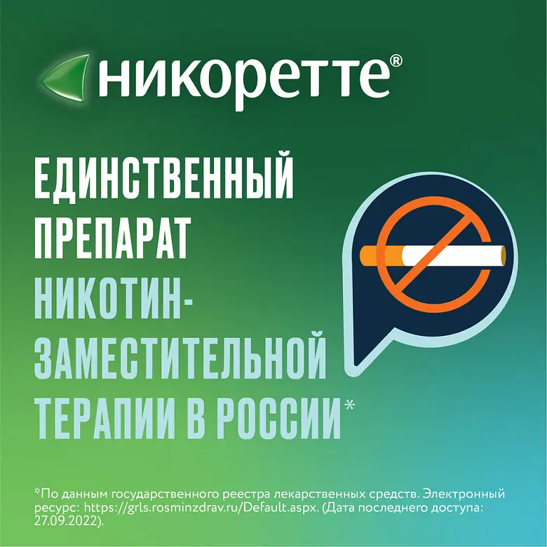 Больным сахарным диабетом после прекращения курения может потребоваться снижение доз инсулина. Дозы никотина, которые легко переносят взрослые курильщики и курильщики-подростки, могут вызвать тяжелую интоксикацию у детей, что может привести к смерти. Важно не оставлять без присмотра препараты, содержащие никотин, поскольку это может повлечь неправильное их применение и проглатывание детьми. Полициклические ароматические углеводороды, содержащиеся в табачном дыме, индуцируют метаболизм препаратов, метаболизируемых изоферментом CYP1A2 (и, возможно, CYP1A1). Прекращение курения может вызывать замедление метаболизма и, как следствие, увеличение концентрации этих препаратов в крови. Это имеет потенциальное клиническое значение для препаратов с узким терапевтическим индексом, например, теофиллина, такрина, клозапина и ропинирола. Лицам с нарушением жевательной функции рекомендуется применять другие лекарственные формы. Лица, пользующиеся зубными протезами, могут испытывать трудности при разжевывании жевательной резинки «Никоретте®». Жевательная резинка может прилипнуть к зубным протезам и в редких случаях привести к их повреждению. Если лекарственное средство пришло в негодность или истек срок годности – не выбрасывайте его в сточные воды или на улицу! Поместите лекарственное средство в пакет и положите в мусорный контейнер. Эти меры помогут защитить окружающую среду!