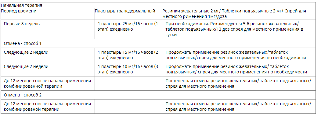 Способ 2: заключается в полной отмене пластыря сразу после окончания этапа Начальной терапии. Далее постепенно снижают количество резинок жевательных/таблеток подъязычных/доз спрея для местного применения до полной отмены в течение времени, которое необходимо пациенту в зависимости от его потребностей, но не позднее, чем через 12 месяцев после начала применения комбинированной терапии.