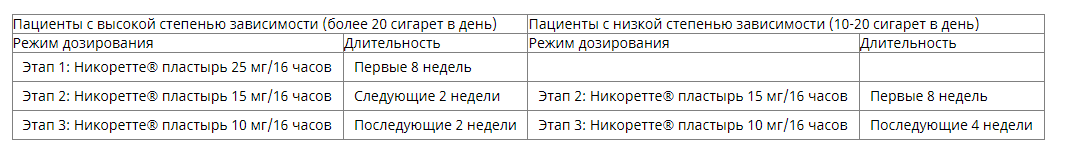 Пациентам с высокой степенью зависимости (более 20 сигарет в день) рекомендуется начинать с 1 этапа терапии, применяя 1 пластырь 25 мг/16 часов, ежедневно, в течение 8 недель. Затем начинают постепенное снижение дозы препарата: 1 пластырь 15 мг/16 часов, ежедневно, в течение 2 недель, а затем - 1 пластырь 10 мг/16 часов, ежедневно, в течение последующих 2 недель.