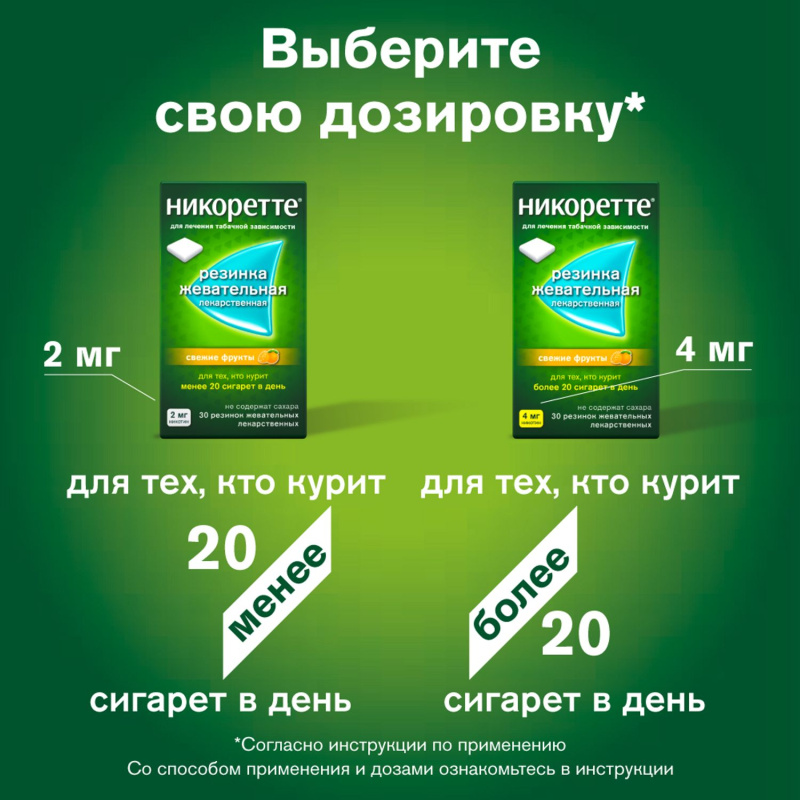 - жевательной резинкой «Никоретте®» 4 мг (повышенное содержание никотина) следует пользоваться, если Вы выкуриваете более 20 сигарет в день или Вам не удалось бросить курить при использовании жевательной резинки в дозе 2 мг.