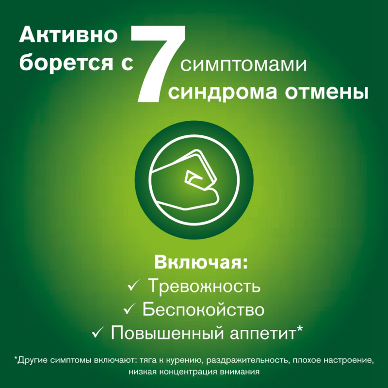 - уменьшение симптомов отмены, возникающих при полном отказе от курения у пациентов, решивших бросить курить;