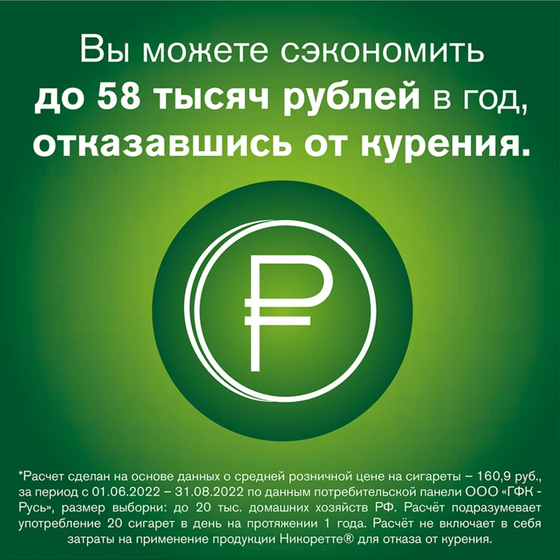 Никоретте® - широкая линейка препаратов никотинзаместительной терапии для отказа от курения. Никоретте® помогает снижать тягу к курению и облегчать различные проявления синдрома отмены. Постепенное снижение дозировки препарата помогает организму вырабатывать привычку жить без никотина, способствуя лечению табачной зависимости. Безопасность и эффективность никотинзаместительной терапии изучалась в 150 клинических исследованиях (1) и рекомендована Всемирной Организацией Здравоохранения как средство лечения табачной зависимости (2) 1-Стэад ЛФ, Перера Р, Баллен С, Мант Д, Хартманн-Бойс Дж, Кахилл К, Ланкастер Т. Никотин-заместительная терапия в отказе от курения. Библиотека Кохрейн. Систематический обзор 2012, Издание 11. 2-Политическая рекомендация по прекращению курения и лечению табачной зависимости. ВОЗ 2003; Примерный перечень ВОЗ основных лекарственных средств 18-ое издание (апрель 2013 г.)