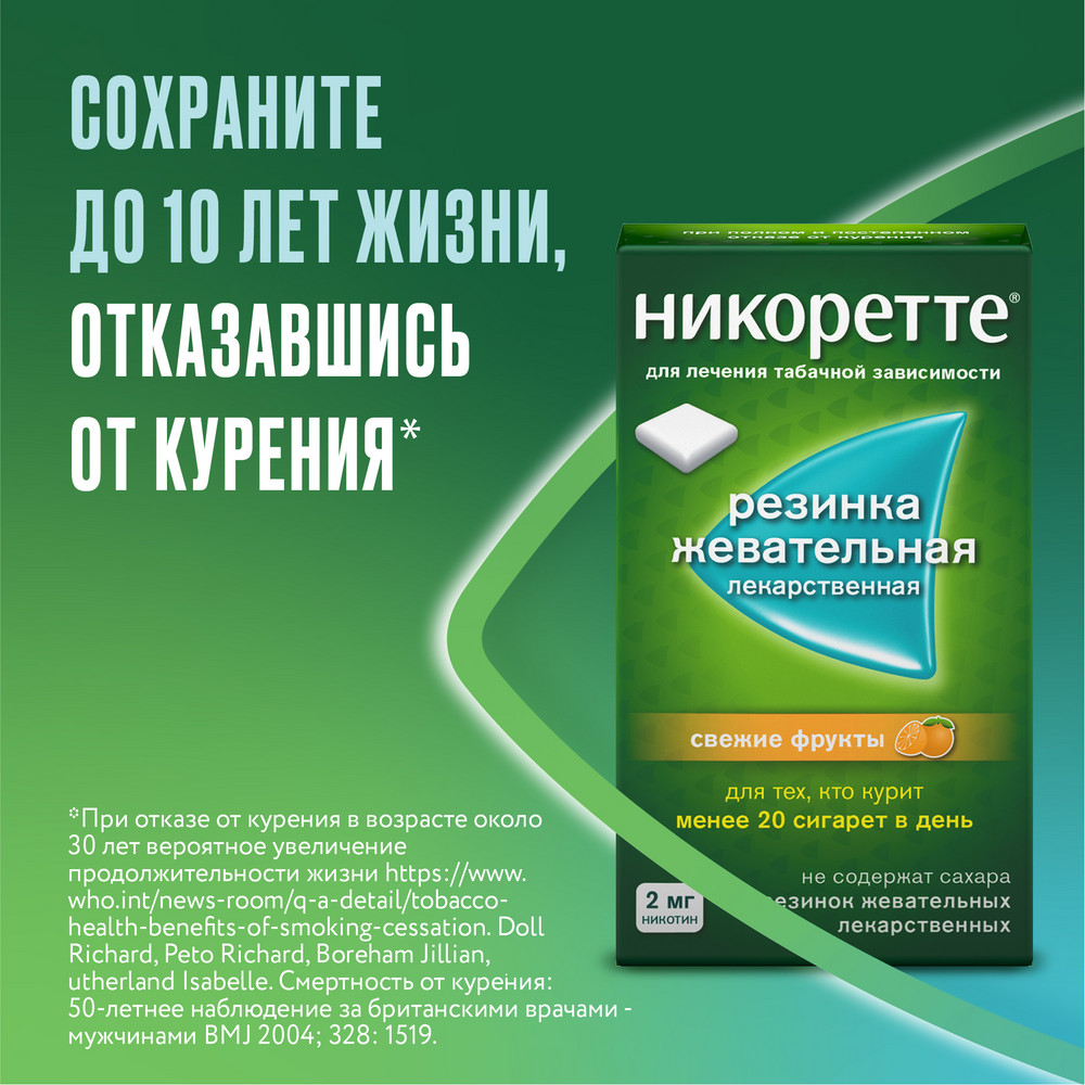 Как работает Никоретте®? Жевательная резинка Никоретте® специально разработана, чтобы позволить Вашему организму постепенно приспосабливаться к отказу от никотина. Препарат для борьбы с тягой к курению содержит медицинский никотин, который выделяется при жевании6. При этом, уровень никотина в жевательной резинке гораздо ниже, чем у сигарет. Постепенное снижение дозировки никотина помогает организму вырабатывать привычку жить без него, способствуя лечению табачной зависимости (7).