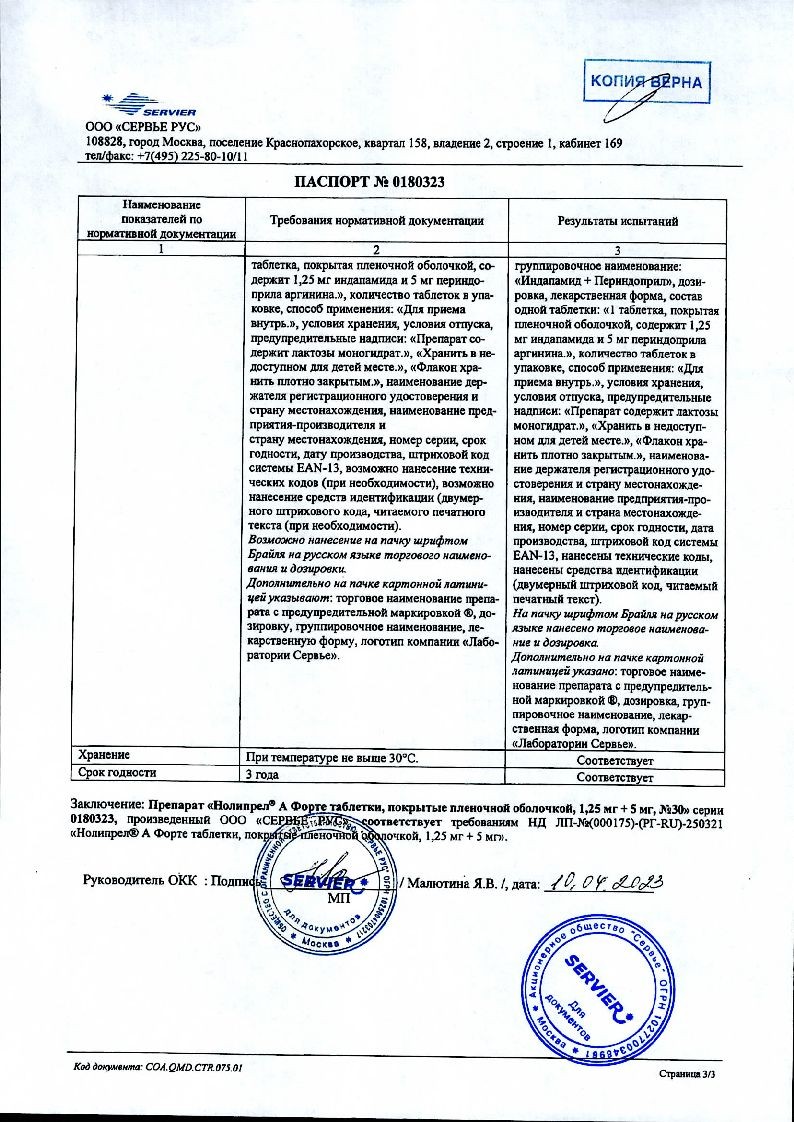 Лекарственный препарат Нолипрел® А форте противопоказан пациентам с тяжелым нарушением функции почек (КК ниже 30 мл/мин).