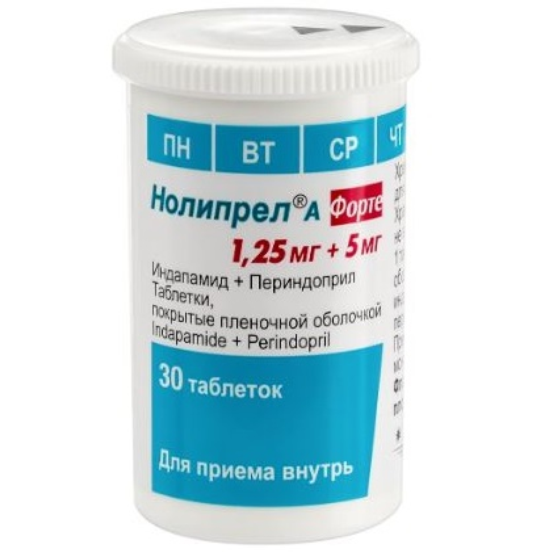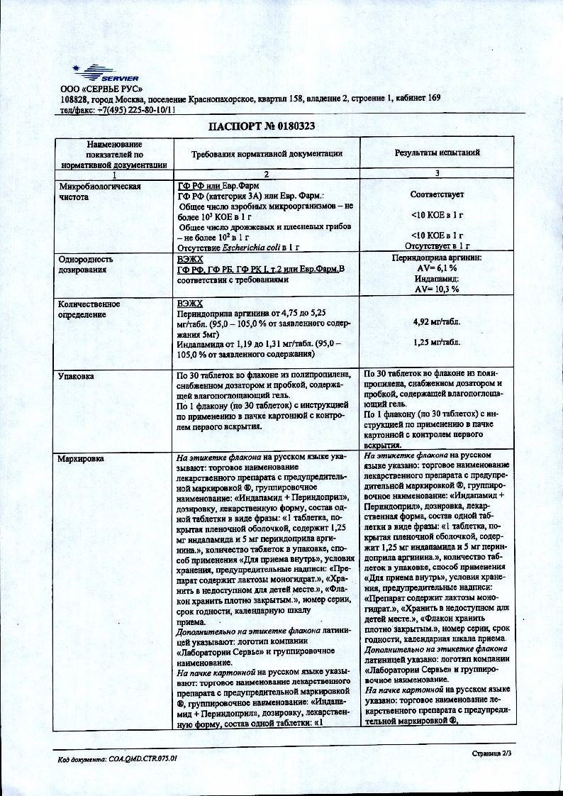 Действующие вещества: индапамида 1,25 мг и периндоприла аргинина 5 мг, что соответствует 3,395 мг периндоприла.
