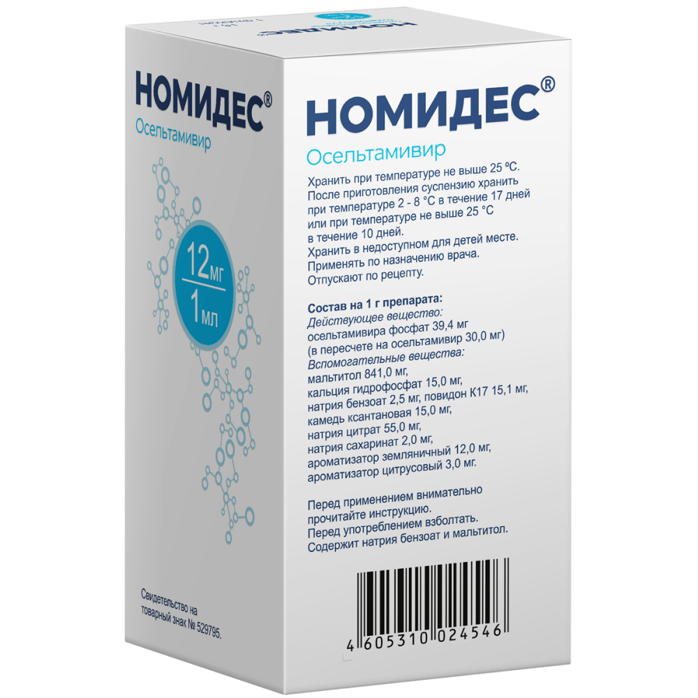 Действующее вещество: осельтамивира фосфат (в пересчете на осельтамивир) - 39,4 мг (30,0 мг);