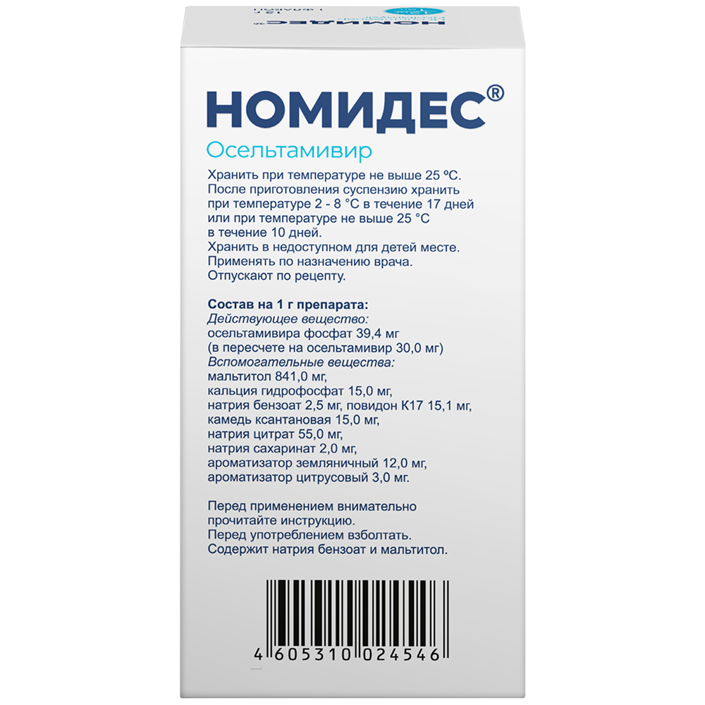 Действующее вещество: осельтамивира фосфат (в пересчете на осельтамивир) - 39,4 мг (30,0 мг);