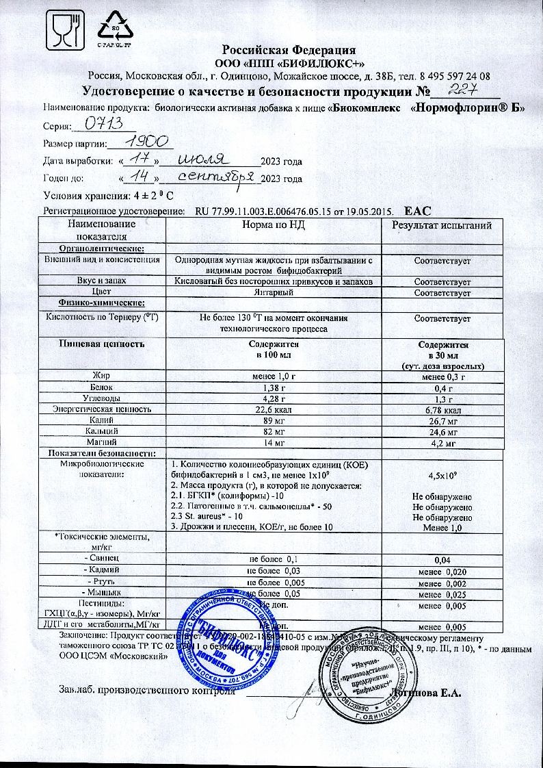 Загрязнители, нормируемые СанПин 2.3.2.1078-01, в биокомплексах Нормофлорин не обнаружены. Компоненты среды и сырья, применяемые при культивировании культур лактобактерий, являются разрешенными в качестве пищевых субстратов.Применение при беременности и кормлении грудью