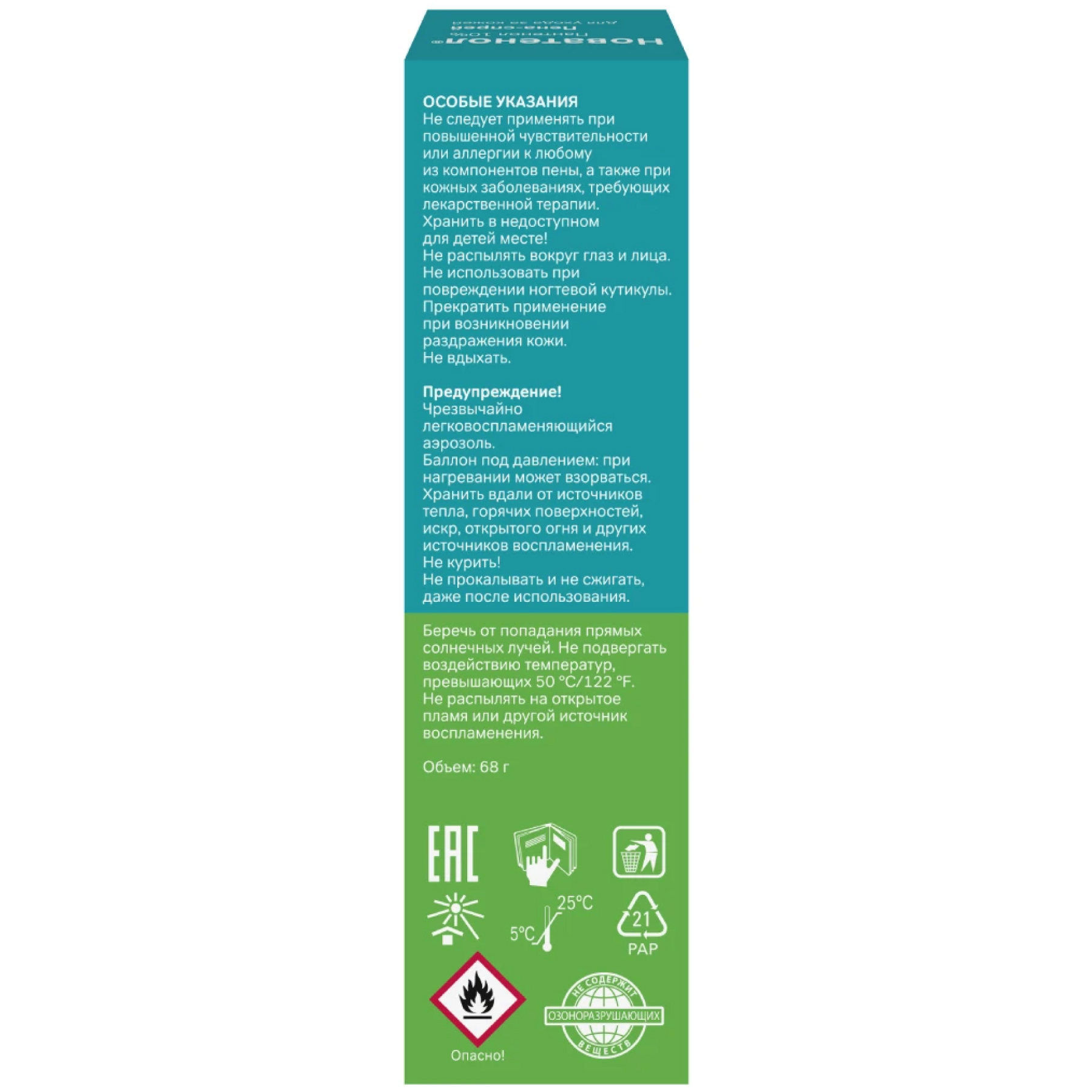 Не курить! Не прокалывать и не сжигать, даже после использования. Беречь от попадания прямых солнечных лучей.