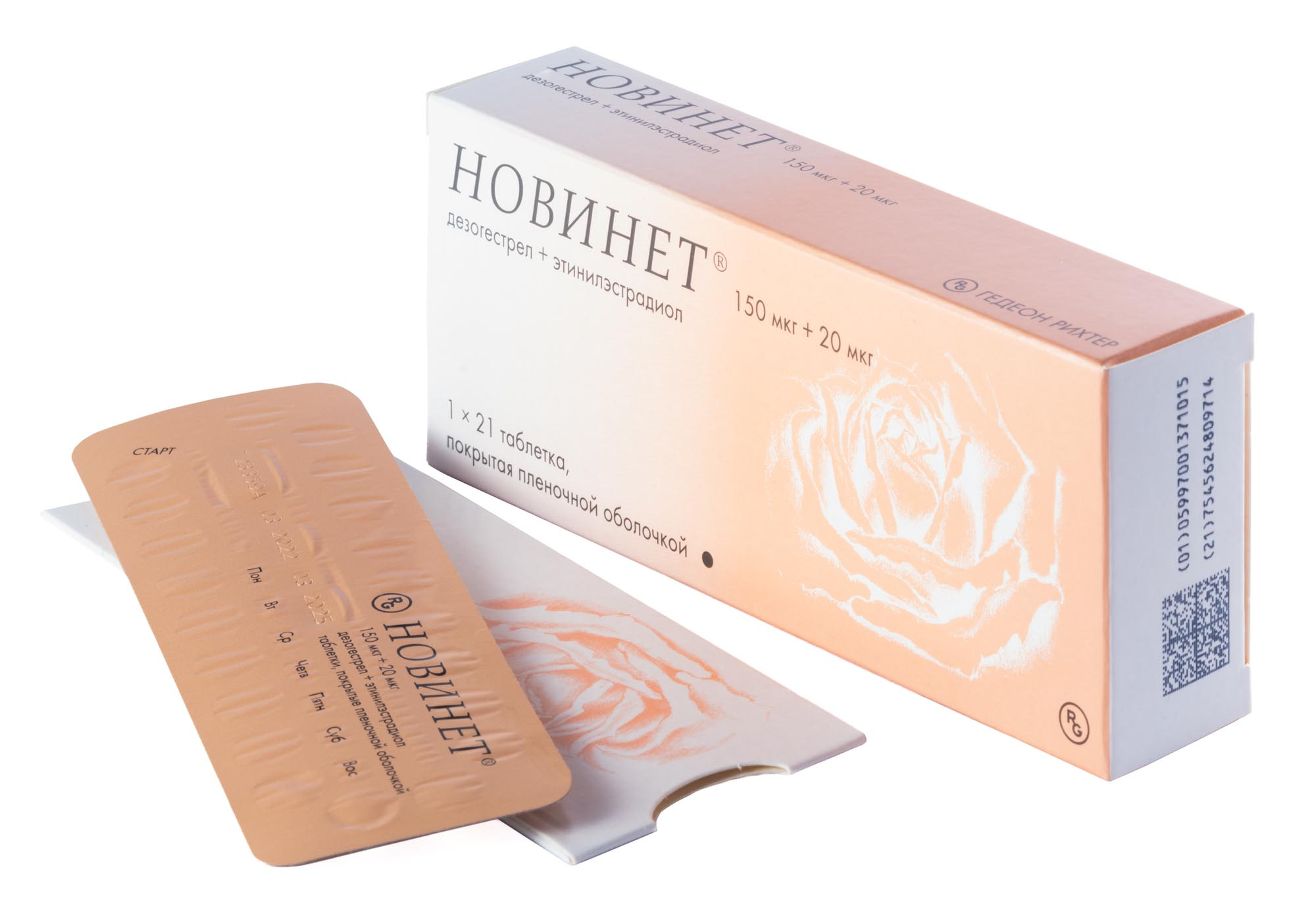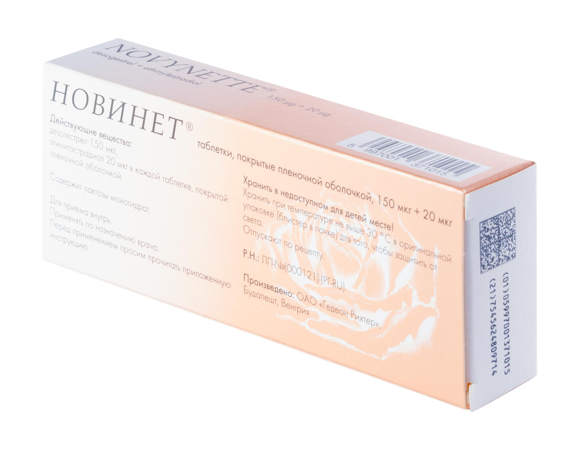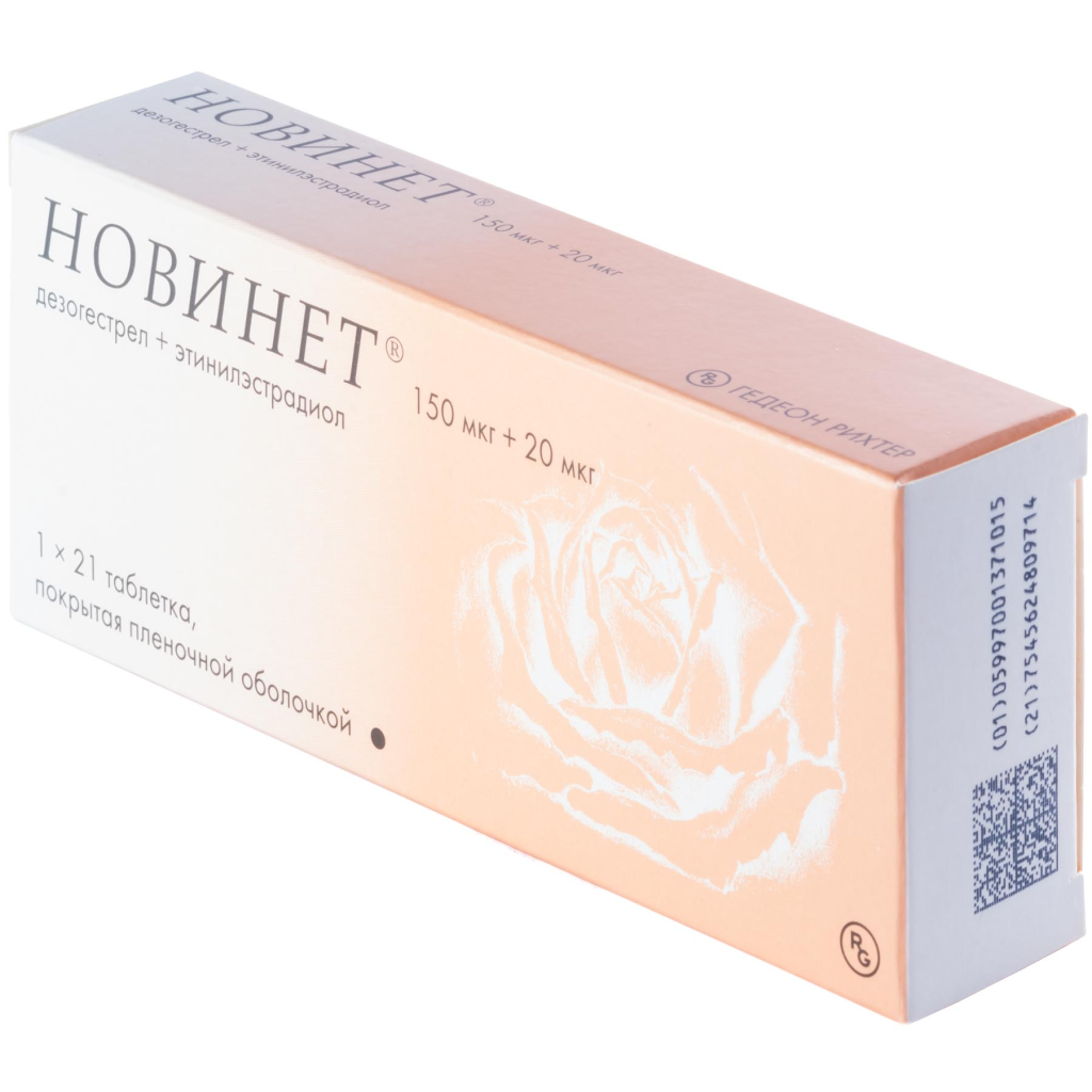 Контрацептивный эффект комбинированных пероральных контрацептивных препаратов (КОК) основан на взаимодействии различных факторов, самыми важными из которых являются подавление овуляции и повышение вязкости секрета шейки матки, препятствующее проникновению сперматозоидов в полость матки. Препарат Новинет® представляет собой комбинацию дезогестрела и этинилэстрадиола: дезогестрел - синтетический прогестаген, обладающий сильной ингибирующей овуляцию активностью, этинилэстрадиол является хорошо известным синтетическим эстрогеном.