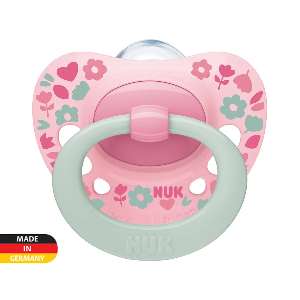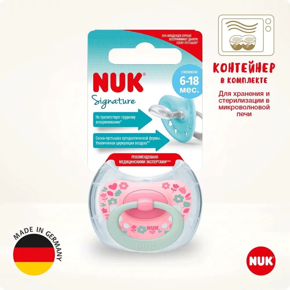 Соски-пустышки имеют оригинальную ортодонтическую форму, способствующую здоровому развитию челюсти ребенка. Разработаны практикующими стоматологами. Форма соски заимствована у самой природы. Все соски – пустышки NUK снабжены антиколиковой системой NUK Air System, выпускающей воздух из сжатой соски, поэтому соска остается мягкой и податливой, прекрасно приспосабливается к ротовой полости младенца.