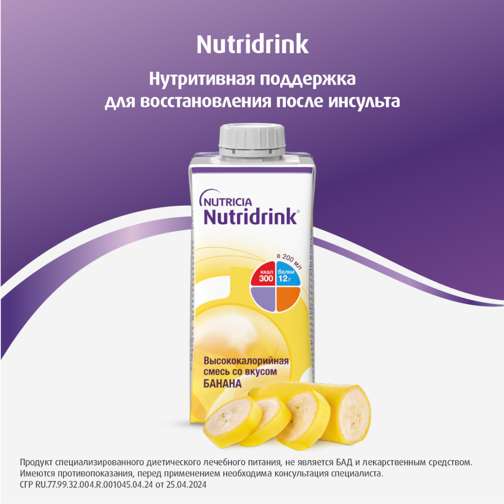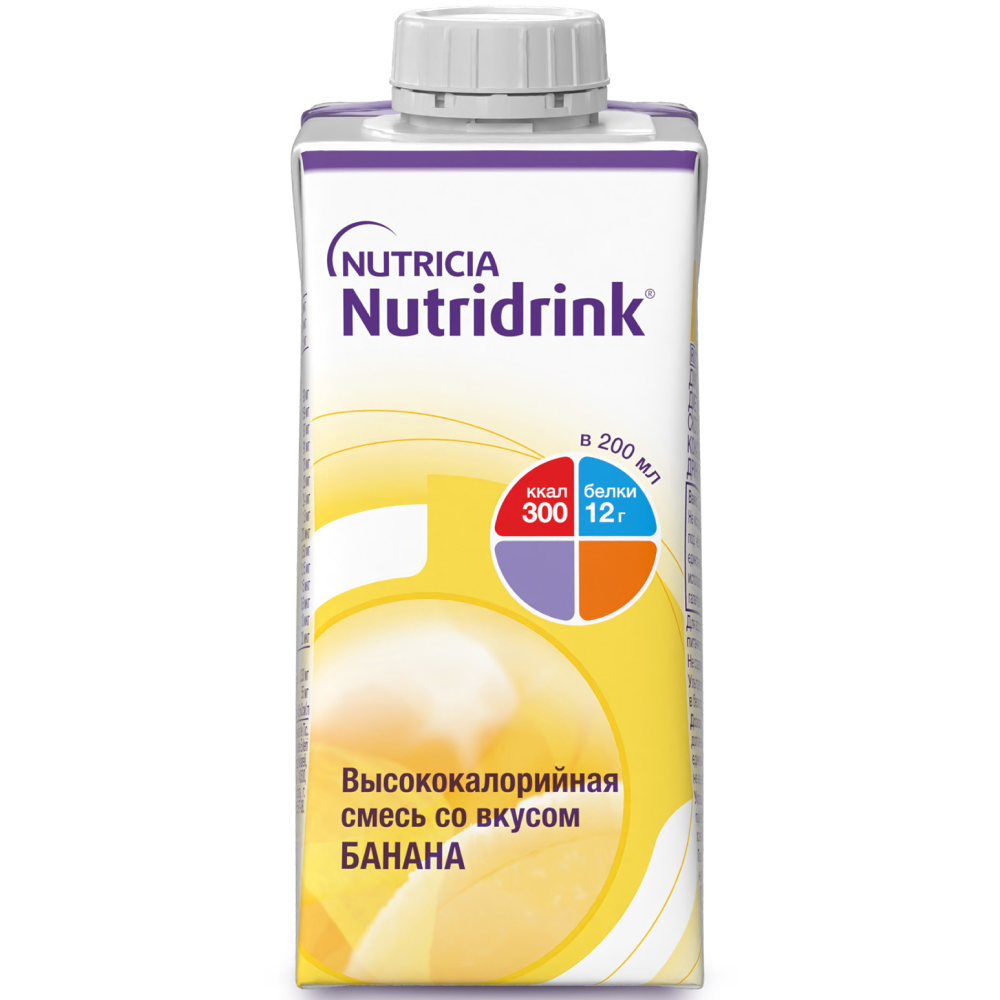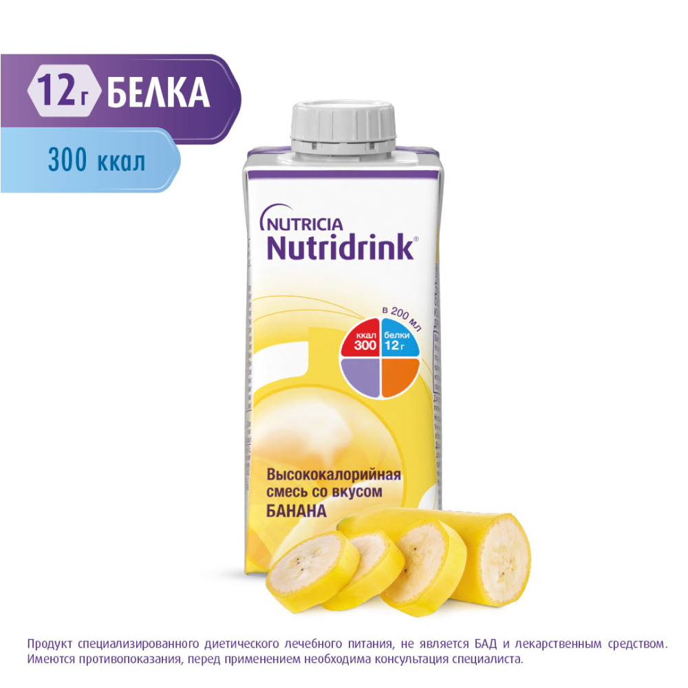 Специализированный продукт диетического лечебного и диетического профилактического питания жидкая высококалорийная смесь для энтерального питания Нутридринк со вкусом банана для ускорения восстановления в период лечения и реабилитации.