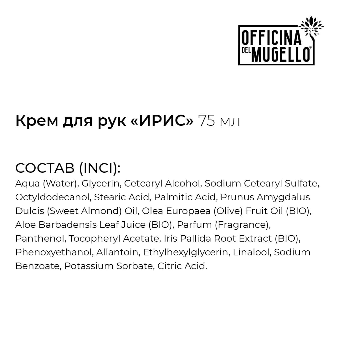 Натуральное косметическое средство для деликатного ухода за кожей рук и защиты от неблагоприятных внешних воздействий. Легкая питательная основа с гелем алоэ, маслами оливы и миндаля и растительным глицерином глубоко увлажняет требовательную кожу рук, придавая ей шелковистость и эластичность. Роскошный экстракт корней ириса активизирует процессы регенерации и дарит головокружительный аромат. Быстро впитывается, не оставляя липкой пленки. Можно использовать несколько раз в день. Гипоаллергенная формула прошла дерматологическое тестирование, подходит для веганов. Сертификат IAIB (Итальянской ассоциации органического сельского хозяйства). Продукты Оффичина дел Мужелло (Флоренция, Италия)– это сочетание традиционных знаний с современными технологиями. Создатели бренда следуют идее создания косметических средств, которые эффективно очищают и ухаживают, не нанося вреда коже. Имеют подтверждение на гипоаллергенность, дерматологически тестированы.