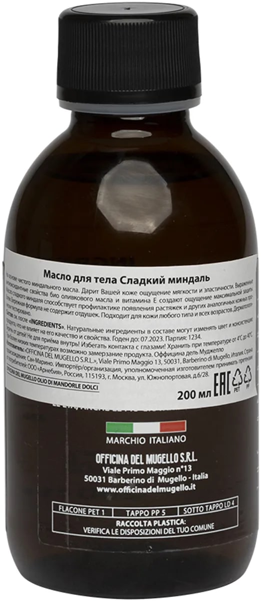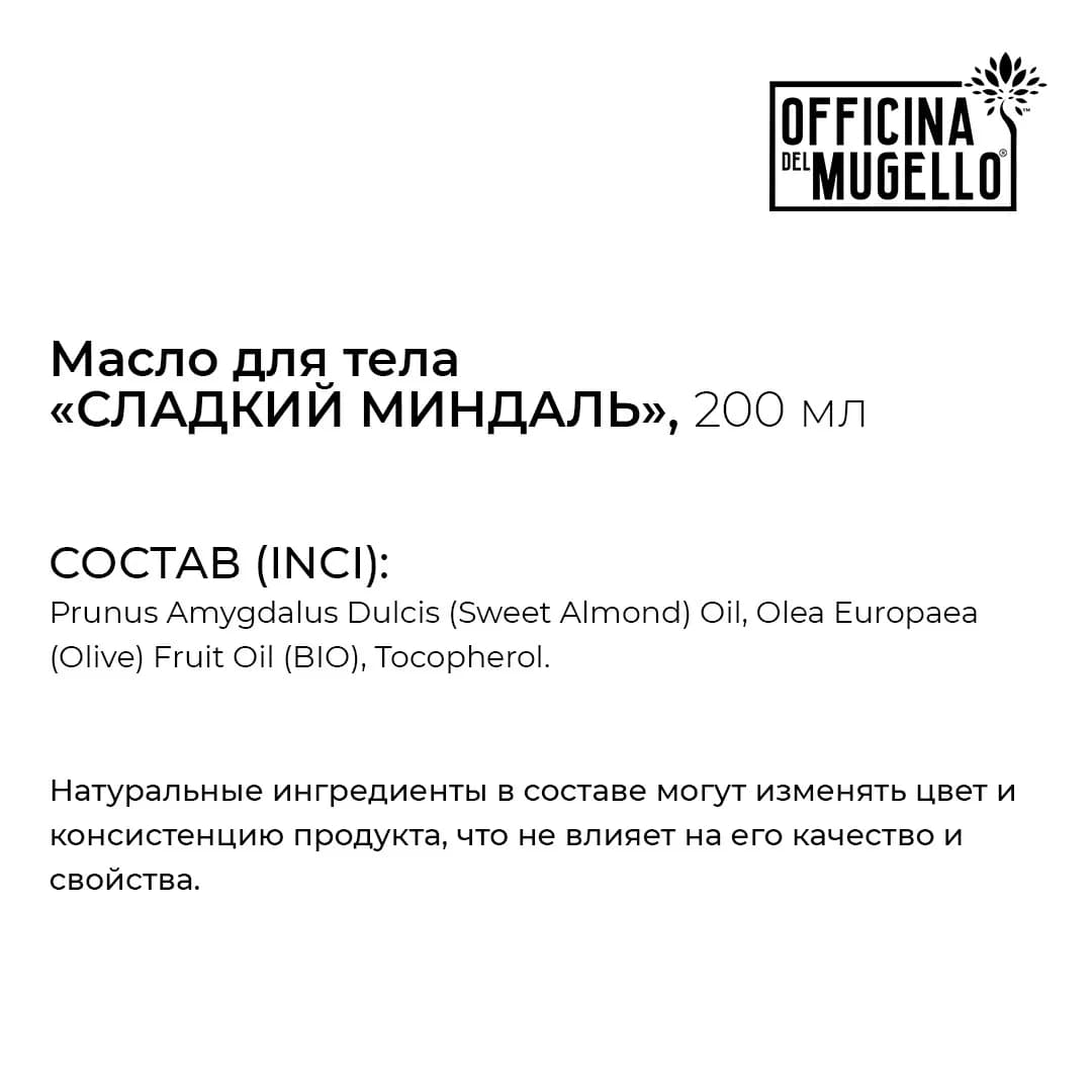 Высококачественное питательное масло для ухода за кожей тела, склонной к сухости и шелушениям. Натуральные масла миндаля и оливы, богатые ценными липидами и антиоксидантами, разглаживают, смягчают, улучшают текстуру кожи, повышают ее эластичность. Гипоаллергенная формула прошла дерматологическое тестирование, подходит для веганов. Сертификат IAIB (Итальянской ассоциации органического сельского хозяйства). Продукты Оффичина дел Мужелло (Флоренция, Италия)– это сочетание традиционных знаний с современными технологиями. Создатели бренда следуют идее создания косметических средств, которые эффективно очищают и ухаживают, не нанося вреда коже. Имеют подтверждение на гипоаллергенность, дерматологически тестированы.