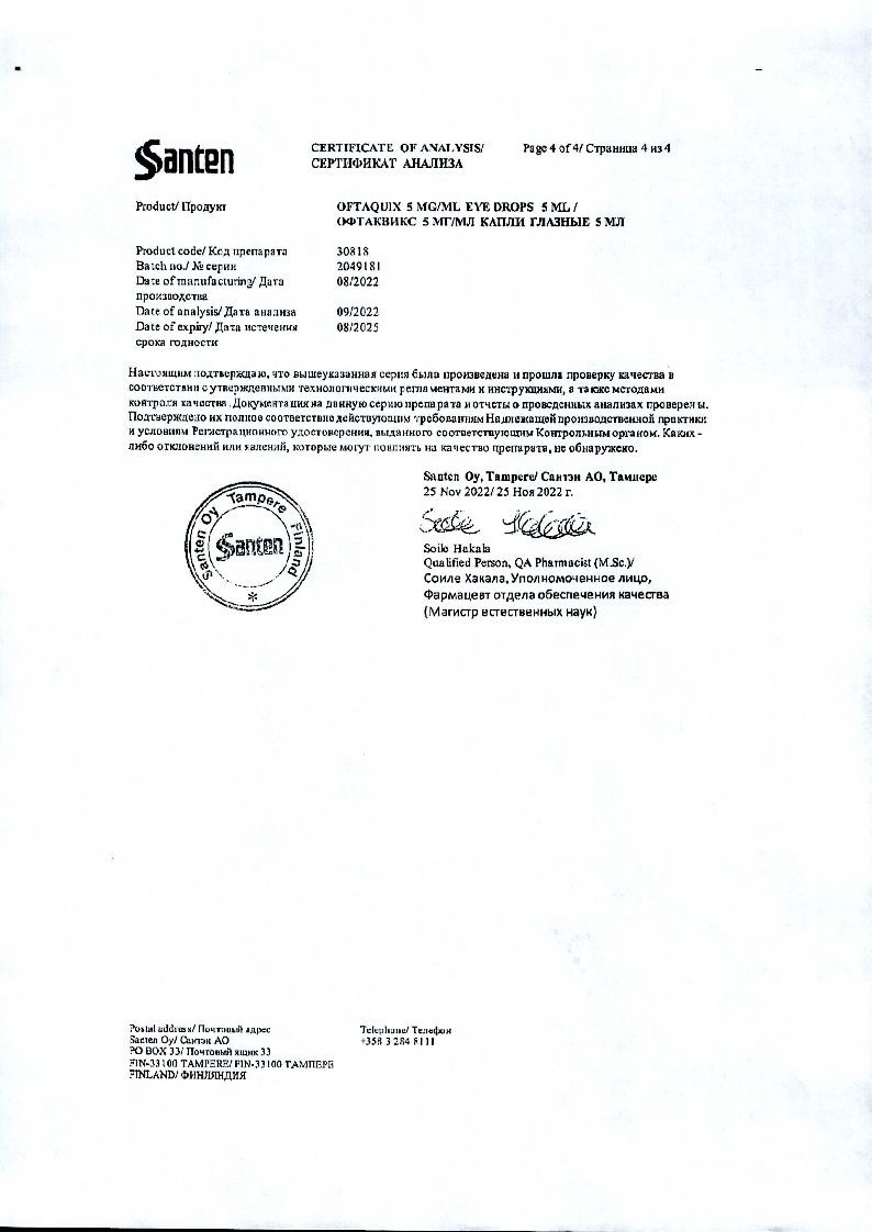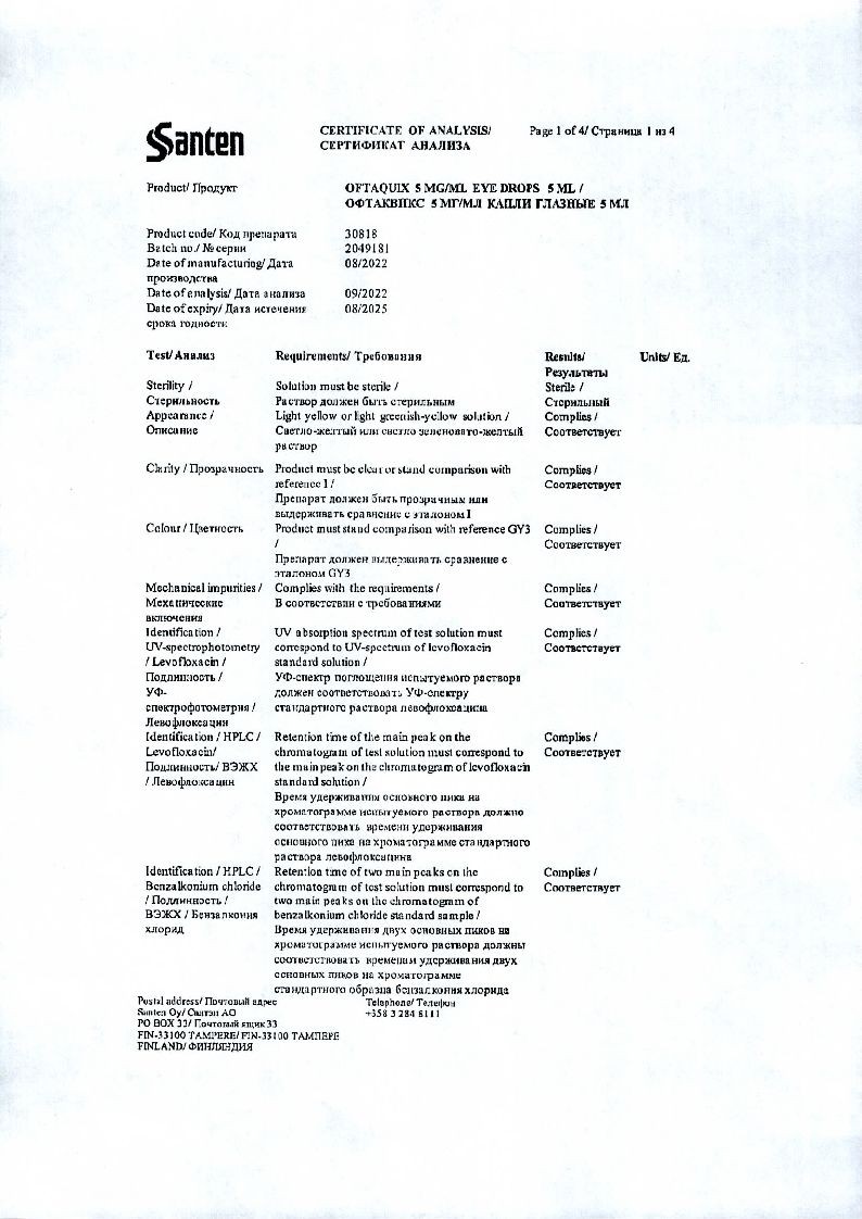 После инстилляции в глаз левофлоксацин хорошо сохраняется в слезной пленке. В исследованиях на здоровых добровольцах было показано, что средние концентрации левофлоксацина в слезной пленке, измеренные через 4 и 6 ч после местного применения составили 17 мкг/мл и 6.6 мкг/мл соответственно. У пяти из шести испытуемых концентрации левофлоксацина составляли 2 мкг/мл и выше через 4 ч после инстилляции. У четырех из шести испытуемых эта концентрация сохранилась через 6 ч после инстилляции.