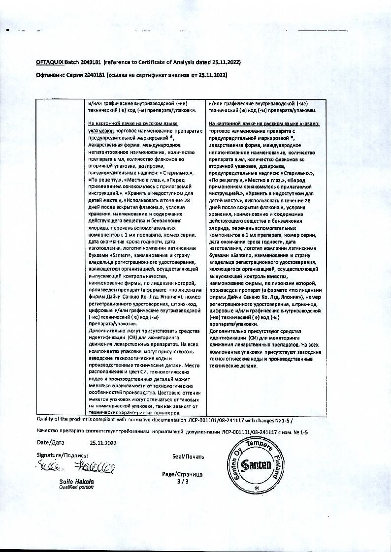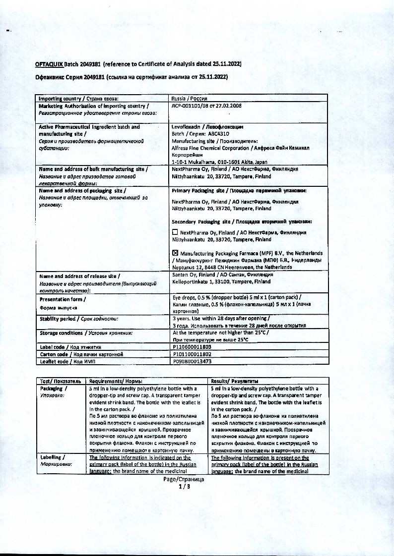 Специальных исследований по взаимодействию глазных капель Офтаквикс не проводилось. Поскольку максимальная концентрация левофлоксацина в плазме после местного применения в глазу минимум в 1000 раз ниже, чем после приема стандартных доз внутрь, взаимодействие с другими лекарственными средствами, характерное для системного применения, скорее всего, клинически незначимо.