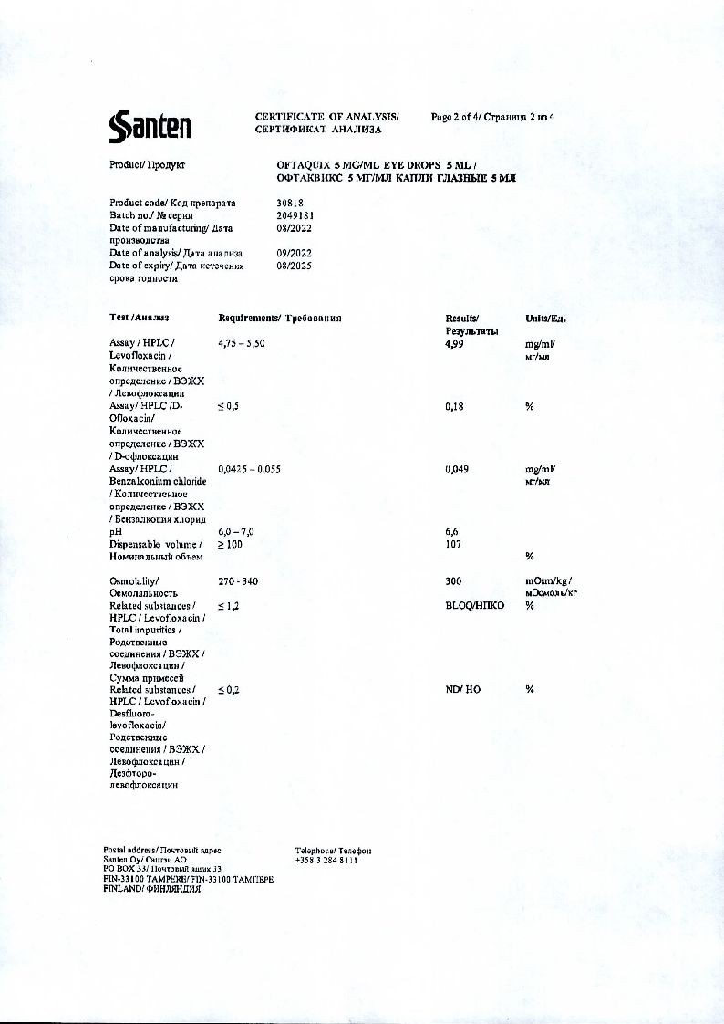Cmax левофлоксацина в плазме, равная 2.25 нг/мл, была выявлена на четвертые сутки после 2 дней применения препарата каждые 2 ч до 8 раз/сут. Cmax левофлоксацина, достигнутая на пятнадцатый день, была более чем в 1000 раз ниже концентрации, отмечающейся после приема внутрь стандартных доз левофлоксацина.
