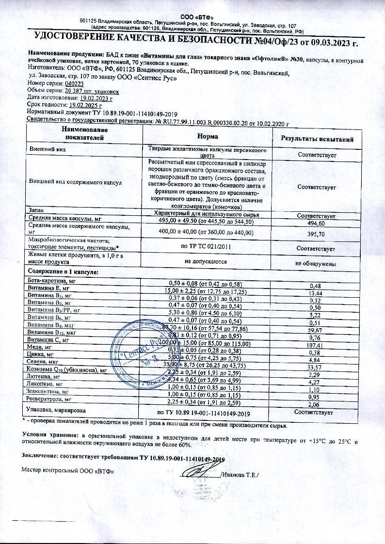 капсула желатиновая: желатин, красители (диоксид титана, хинолиновый желтый, азорубин); лютеин 5% (модифицированный крахмал, кукурузный крахмал, глюкозный сироп, лютеин, натрия аскорбат, D,L-альфа-токоферол), токоферола ацетат 50% (D,L-альфа-токоферола ацетат, модифицированный крахмал, мальтодекстрин, диоксид кремния), зеаксантин 5% (модифицированный крахмал, кукурузный крахмал, сахароза, зеаксантин, натрия аскорбат, D,L-альфа-токоферол), цинка цитрат, ликопин 10%(модифицированный крахмал, кукурузный крахмал, ликопин, глюкозный сироп, натрия аскорбат, D,L-альфа-токоферол), ниацинамид;