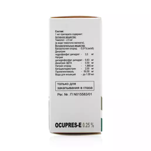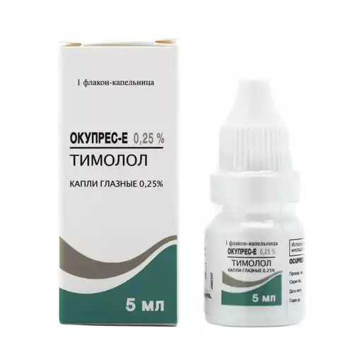 В начале терапии закапывают по 1 капле препарата Окупрес-Е 0,25% и 0,5% в больной глаз 2 раза в день.