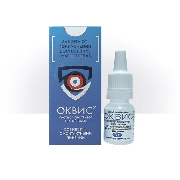 Оквис - вязкоэластичный раствор, при закапывании которого происходит обволакивание поверхностей роговицы и конъюнктивы. Его действие, как протектора основано на умеренном противовоспалительном и противоотечном действии включенного в состав хондроитин сульфата, обладающего защитными свойствами.