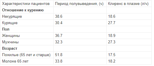 Фармакокинетические показатели оланзапина варьируют в зависимости от курения, пола и возраста (см. таблицу 1):