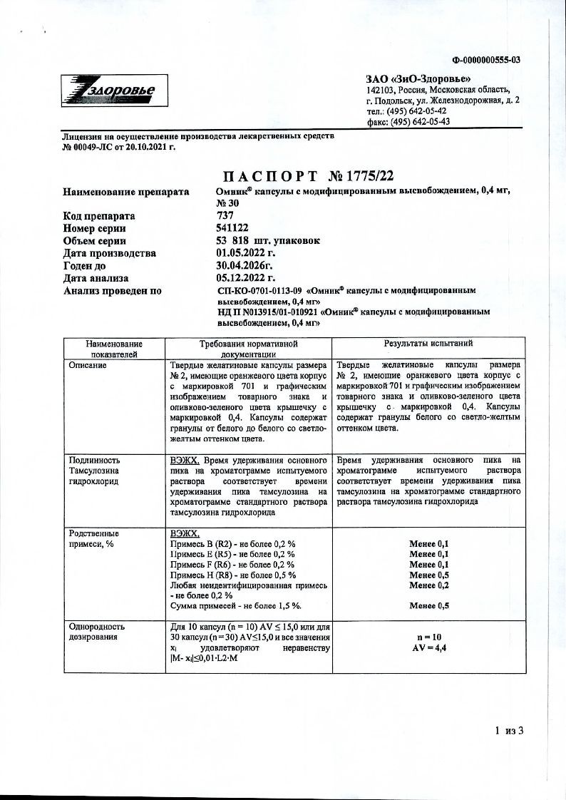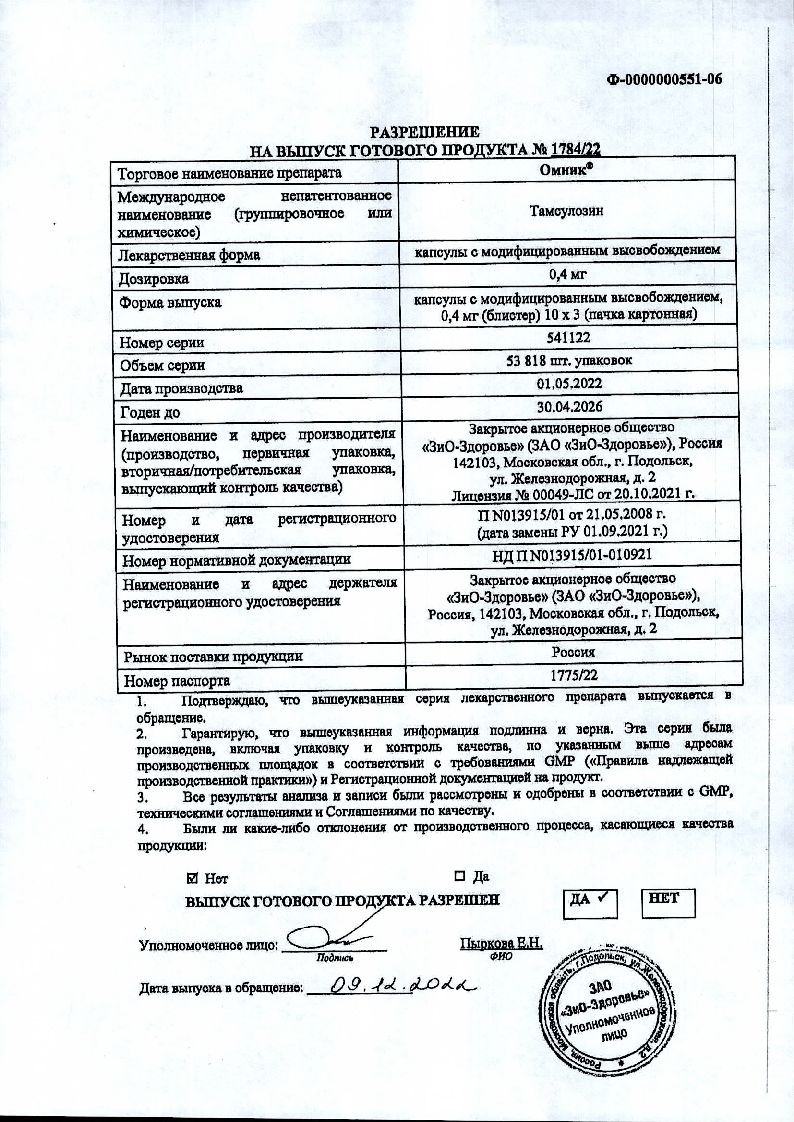Активное вещество: тамсулозина гидрохлорид 400 мкг.
