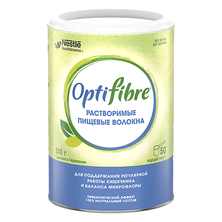 БАД. Не является лекарственным средством. Перед применением рекомендуется проконсультироваться с врачом (специалистом). ОптиФайбер – 100% натуральное средство для поддержания комфортной и регулярной работы кишечника, которое оказывает двойное действие: помогает смягчить и правильно сформировать стул, питает полезные бактерии в кишечнике (Lactobacilli и Bifidobacteria). 100% натуральный состав - Удобен в применении: без вкуса, запаха, полностью растворим, не меняет консистенцию и вкусовые качества блюд и напитков. Можно добавлять к любой еде и негазированным напиткам - Подходит для регулярного и длительного применения. Не вызывает привыкания. Может применяться неограниченно по времени - Сделано в Германии - Двойное действие частично гидролизованных пищевых волокон, из которых на 100% состоит ОптиФайбер: естественным образом помогают работе и освобождению кишечника и способствуют восстановлению баланса кишечной микрофлоры - Эффект пребиотика - 2 формы: банка 250гр. - экономичное решение, пачка с саше-пакетиками 80гр. (16шт. по 5гр.) - удобно брать с собой - Действие растворимых волокон, из которых на 100% состоит ОптиФайбер, подтверждено более 50 клиническими исследованиями