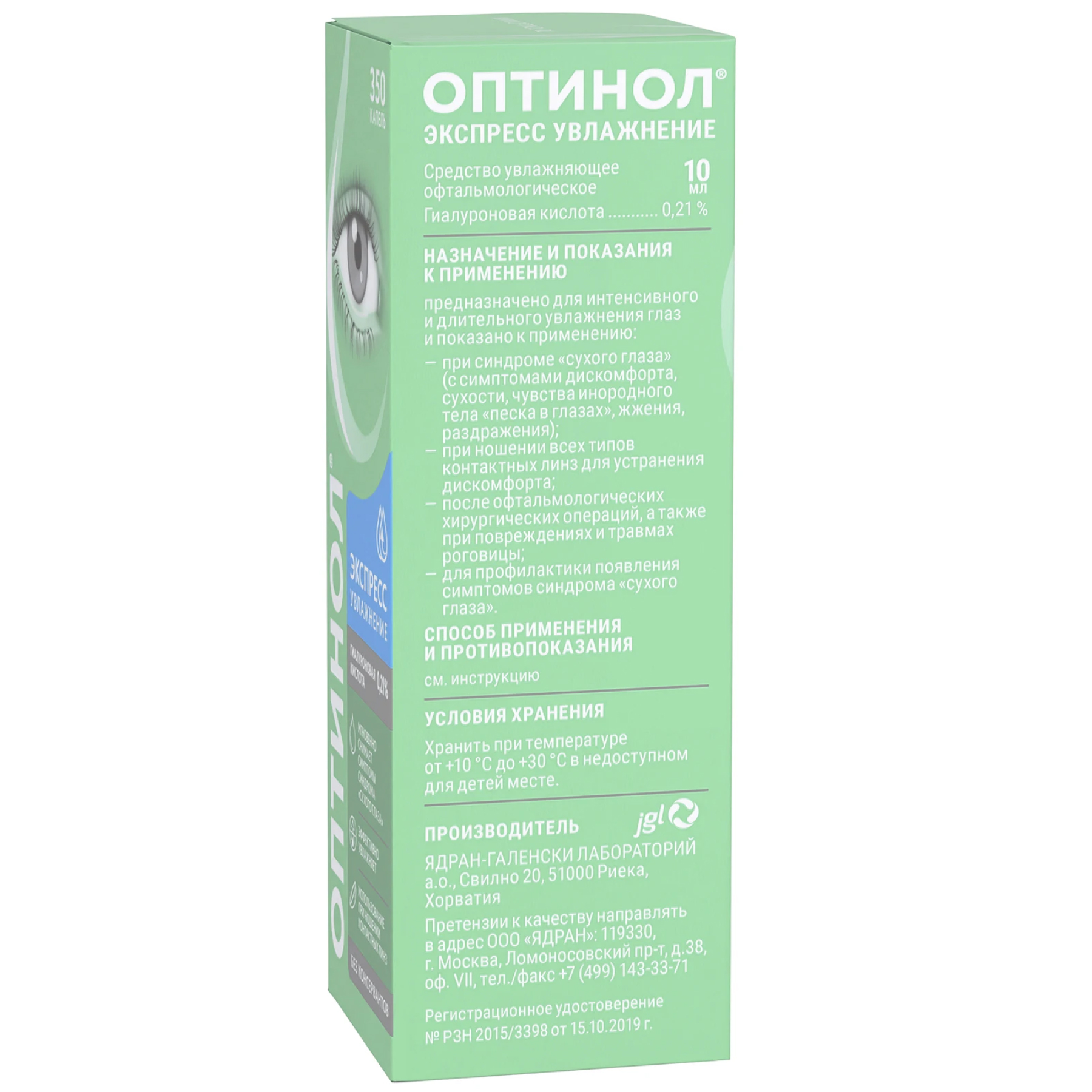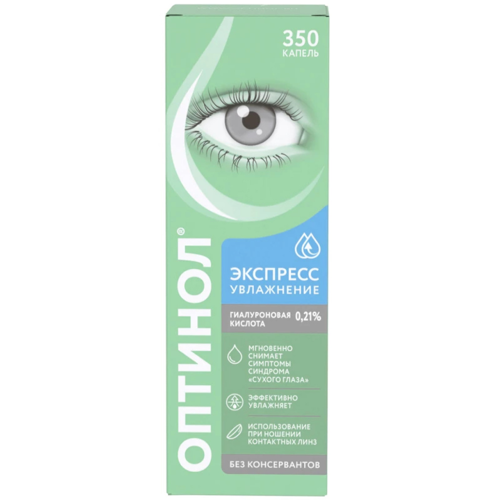 Средство увлажняющее офтальмологическое «Оптинол®» Экспресс увлажнение представляет собой изотонический (рН 6,0 – 7,5), буферизированный, стерильный раствор, содержащий в своем составе гиалуроновую кислоту в виде натрия гиалуроната, которая является природным увлажняющим веществом с высокой способностью связываться с водой.