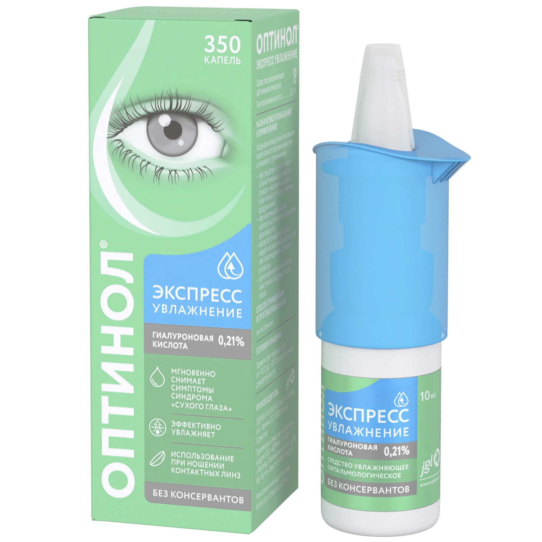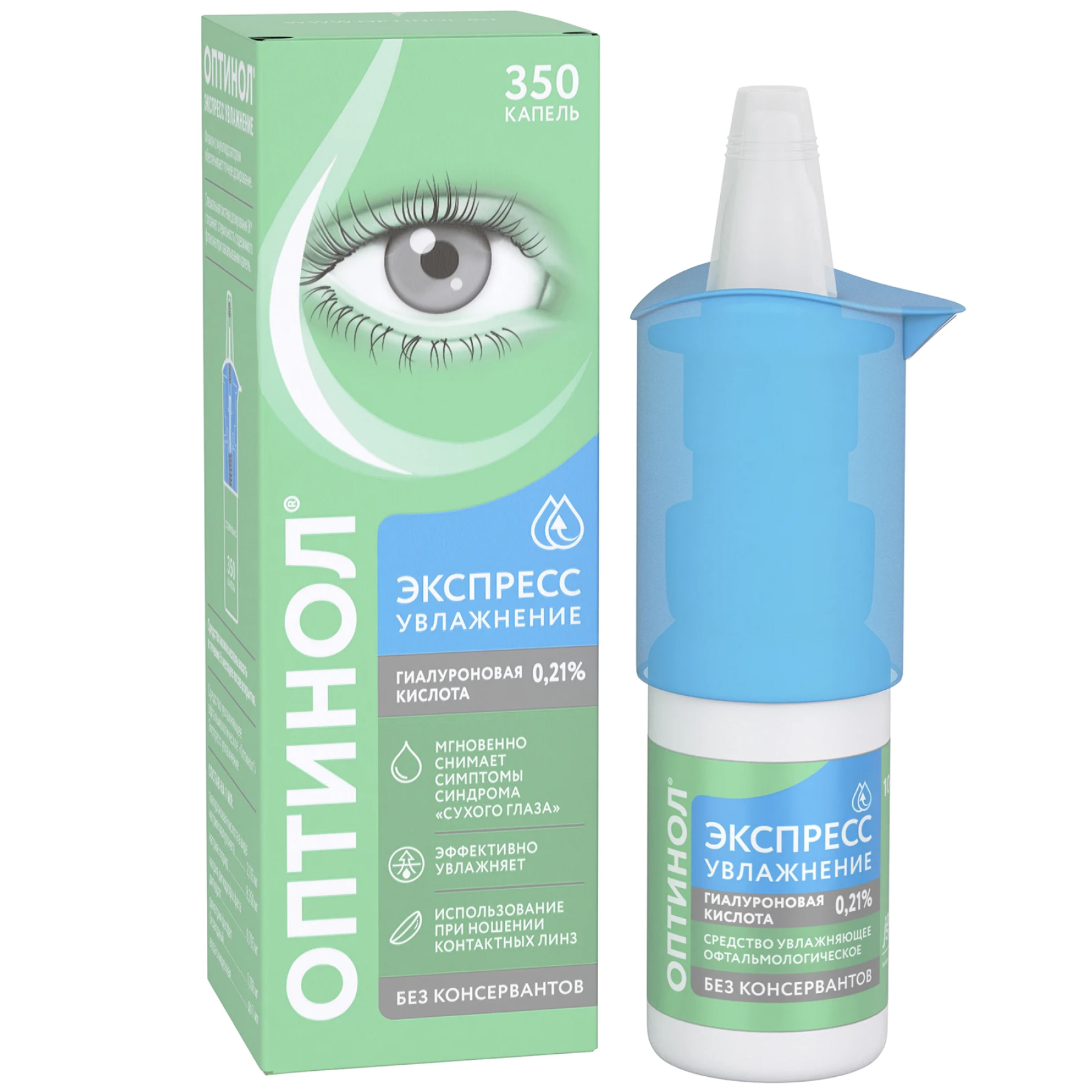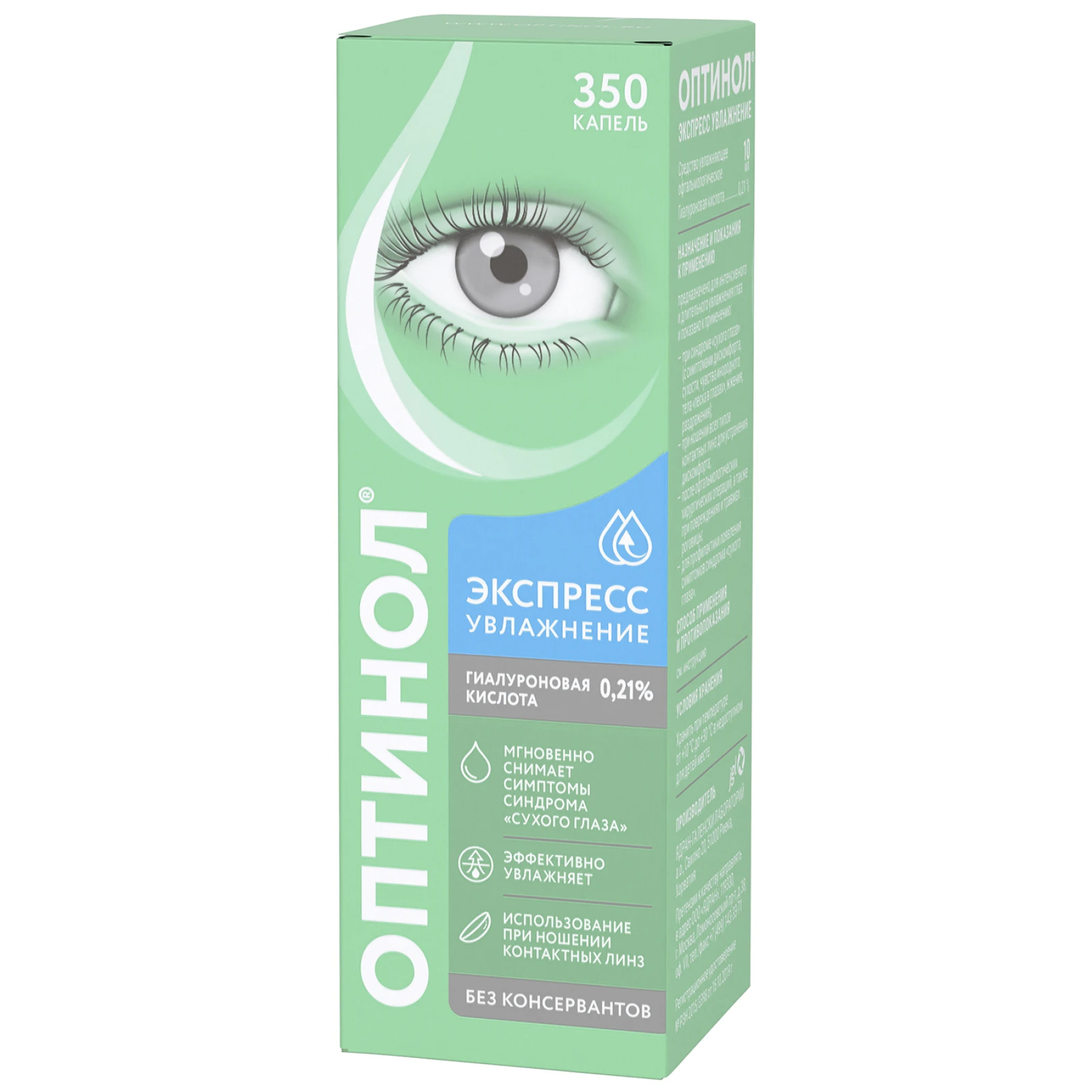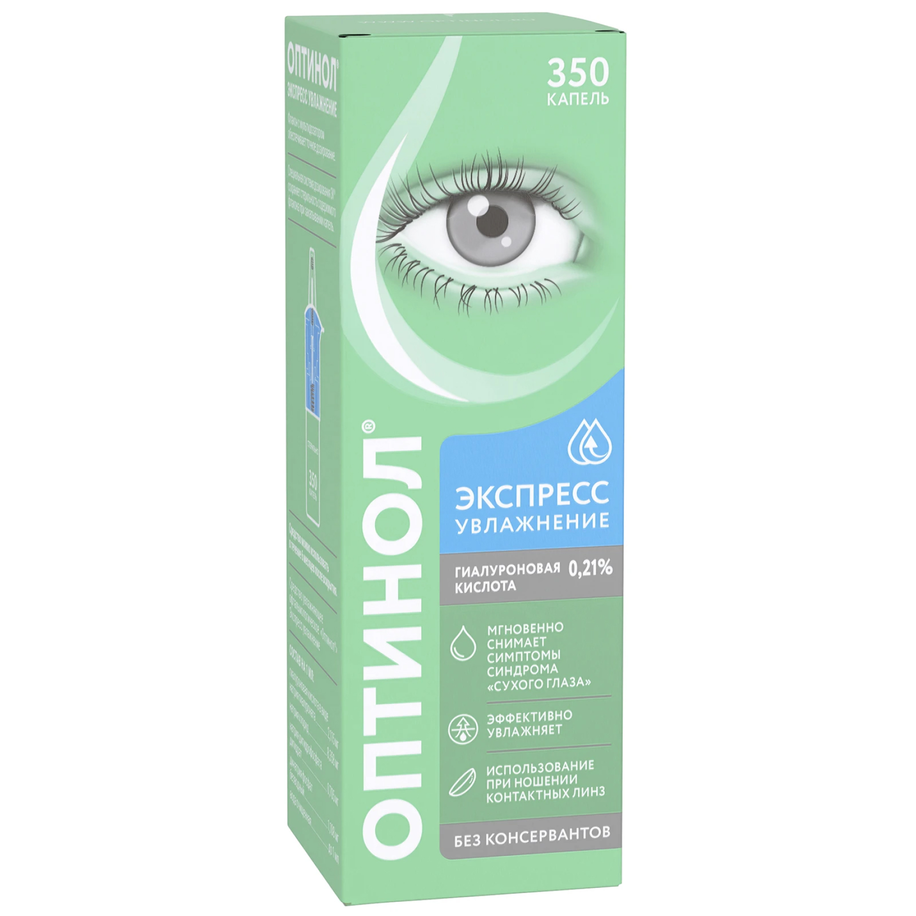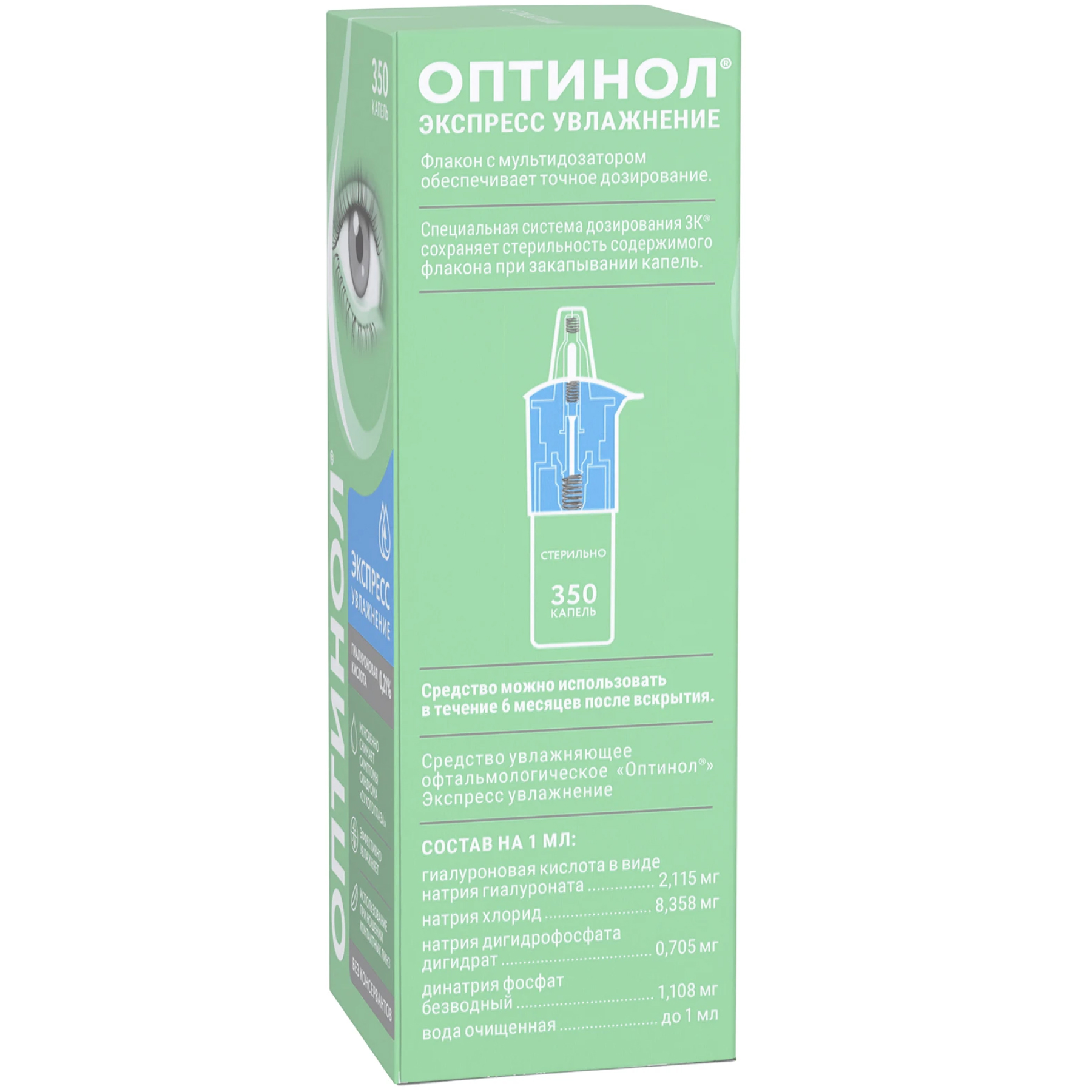 Отсутствие консервантов и наличие природного увлажняющего вещества (гиалуроновой кислоты в виде натриевой соли) обеспечивает хорошую переносимость средства Оптинол® Экспресс Увлажнение даже при длительном применении. Благодаря специально разработанному механизму флакона раствор остается стерильным в течение 180 дней (6 месяцев) после первого применения, при этом не содержит консервантов. Мультидозатор флакона обеспечивает точность дозирования и удобство применения средства Оптинол® Экспресс Увлажнение. Флакон содержит 350 капель.