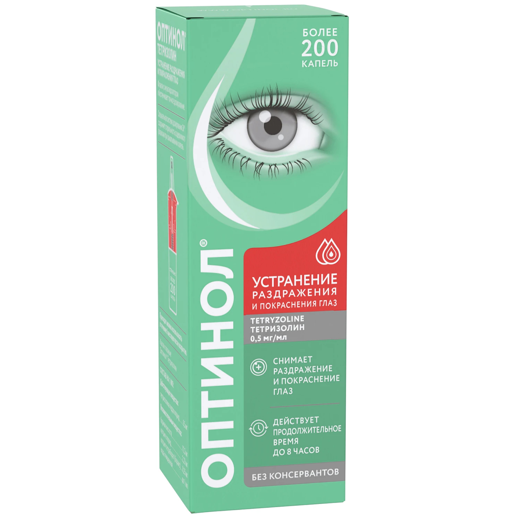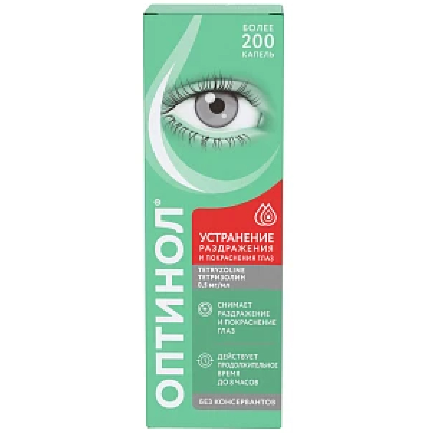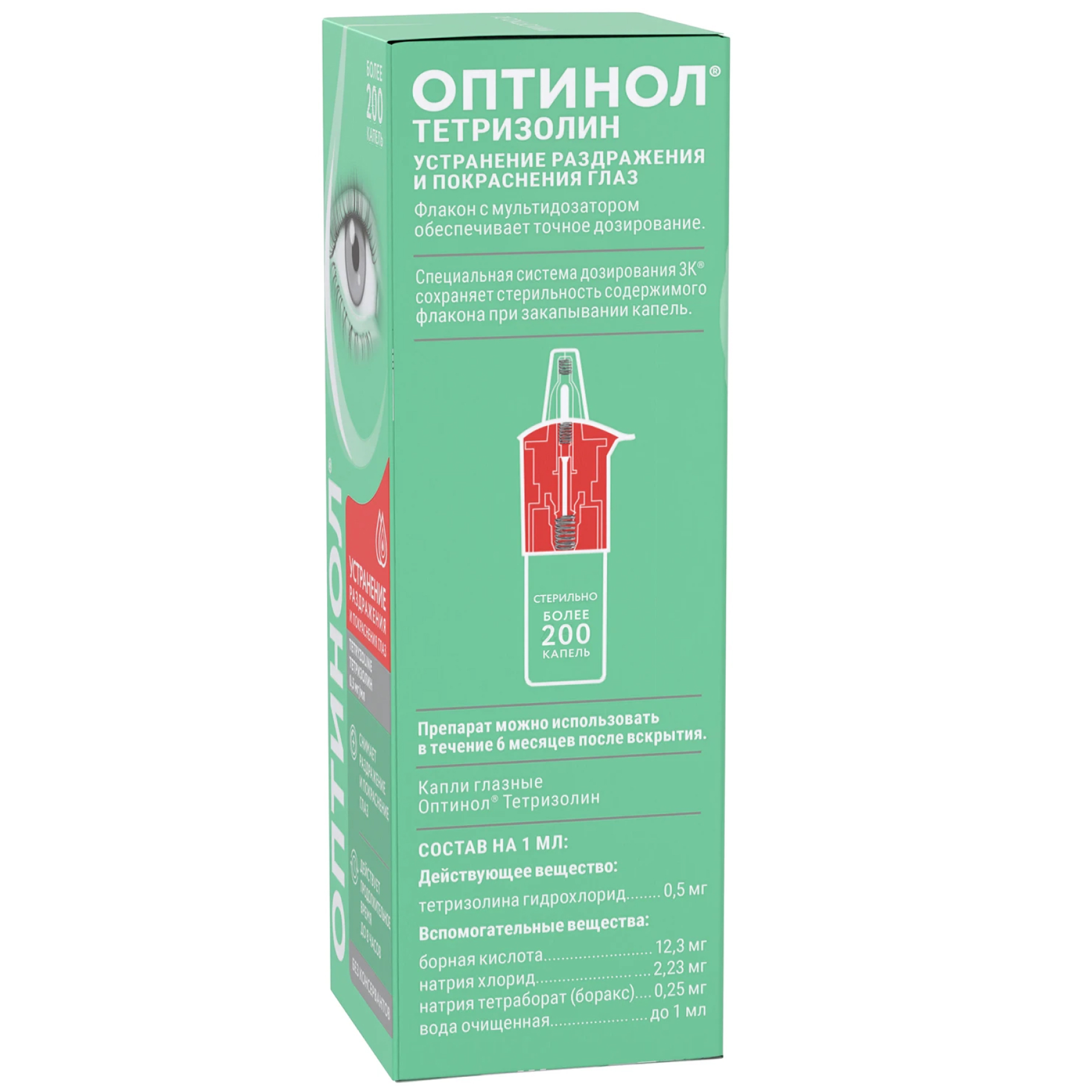 Благодаря специально разработанному механизму флакона, раствор остается стерильным в течение 180 дней (6 месяцев) после первого применения, при этом не содержит консервантов. Мультидозатор флакона обеспечивает точность дозирования и удобство применения препарата ОПТИНОЛ® ТЕТРИЗОЛИН. Флакон содержит 450 капель.