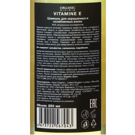 Нанести небольшое количество шампуня на влажные волосы и кожу головы, вспенить массажными движениями и смыть. После применения шампуня рекомендуется использовать бальзам или маску для волос Organic Guru.
