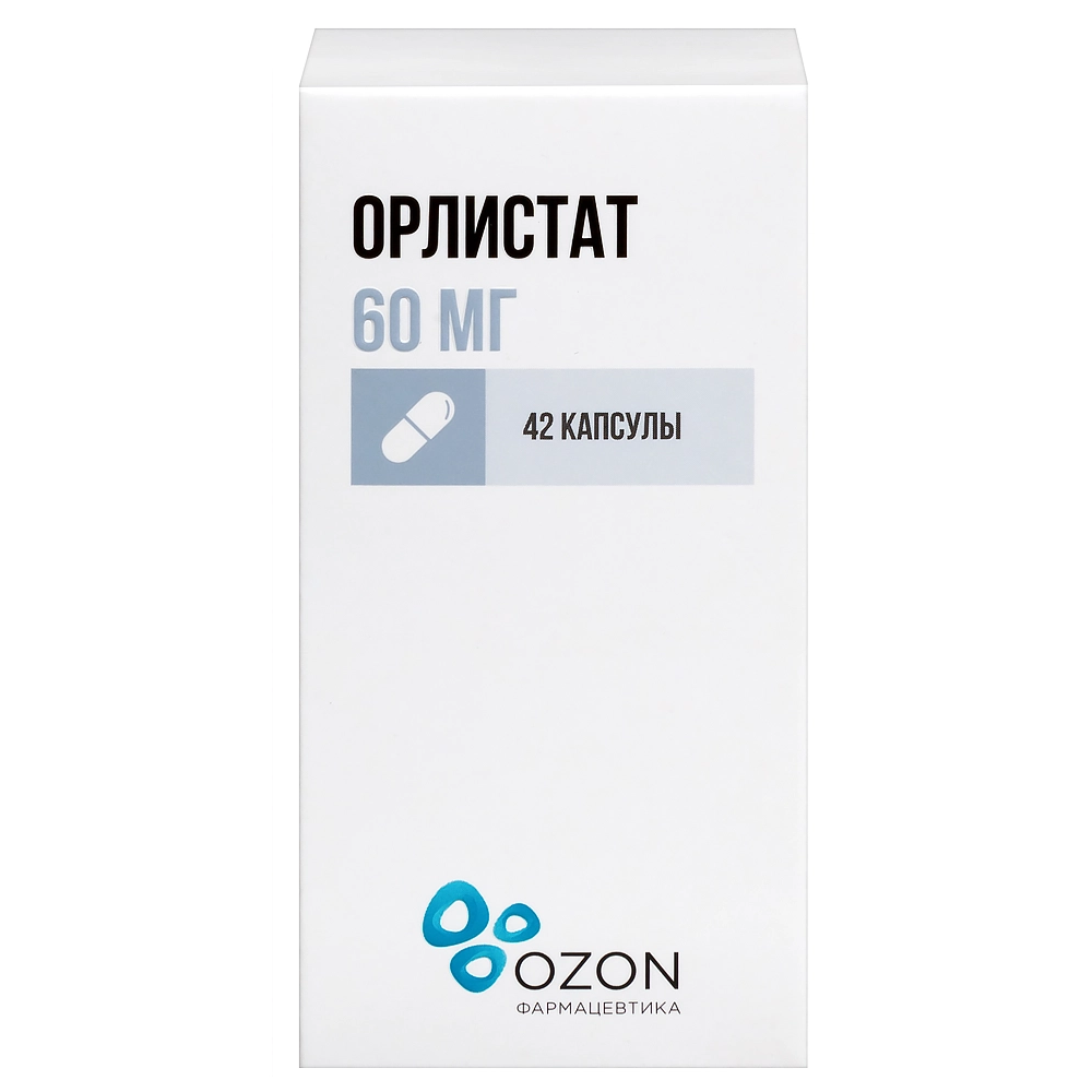 Действующее вещество: орлистат, субстанция-пеллеты 50% - 120,00 мг, в пересчете на орлистат - 60,00 мг.