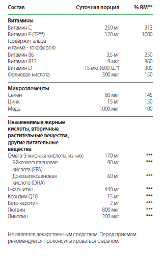 Состав (капсула): рыбий жир, желатин, D-α-токоферолацетат (витамин Е), глицерин (влагоудерживающий агент), сорбитол (эмульгатор), вода, коэнзим Q10, лютеин, бета-каротин, медный комплекс хлорофиллина (краситель), ликопин, диоксид титана (краситель), холекальциферол (витамин D). Содержит подсластитель. При чрезмерном употреблении может оказывать слабительное действие.
