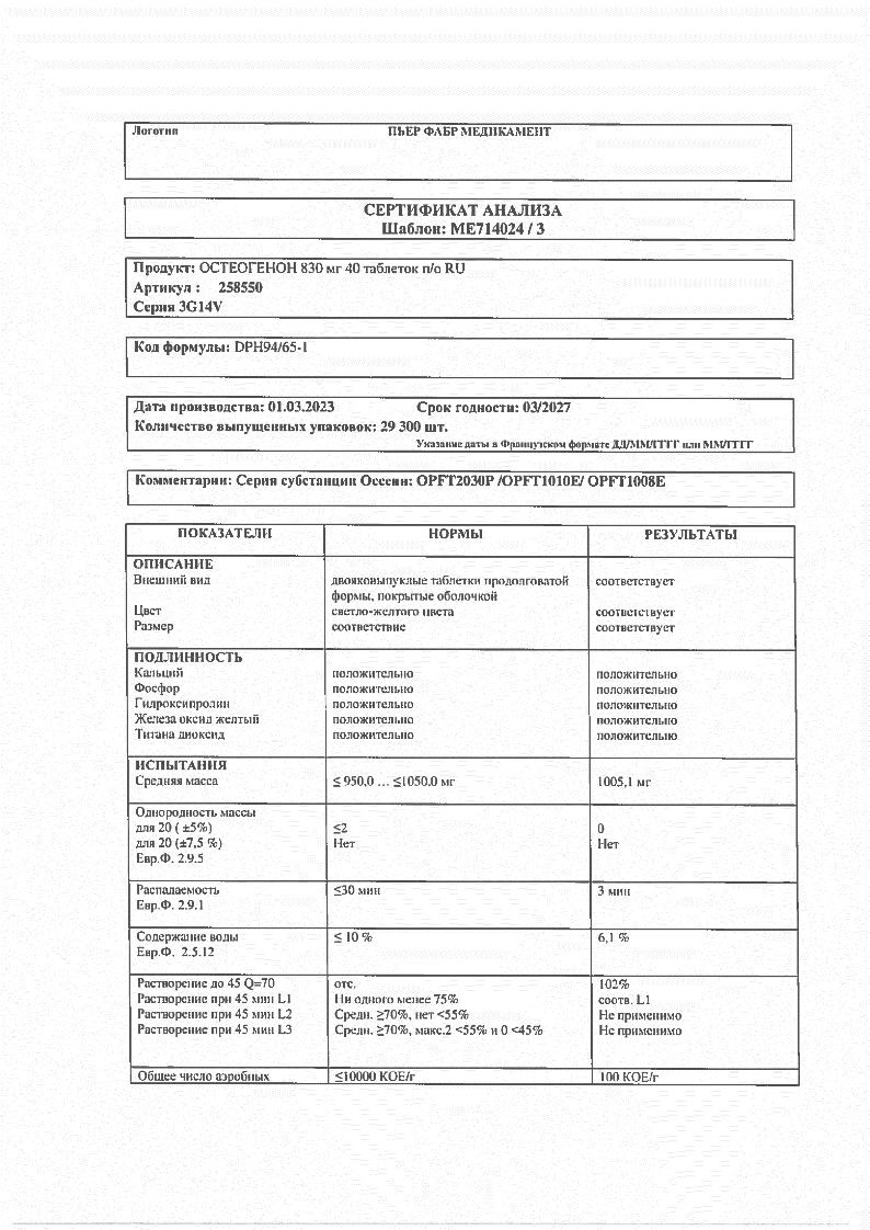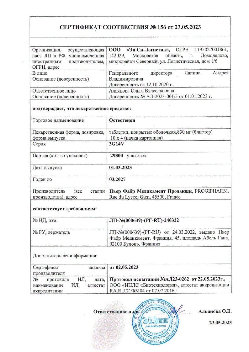 Активное вещество: соединение оссеин-гидроксиапатит (ОГС) - 830 мг (относится к сухой субстанции), соответствующее: оссеин - около 291 мг, состоящий из: