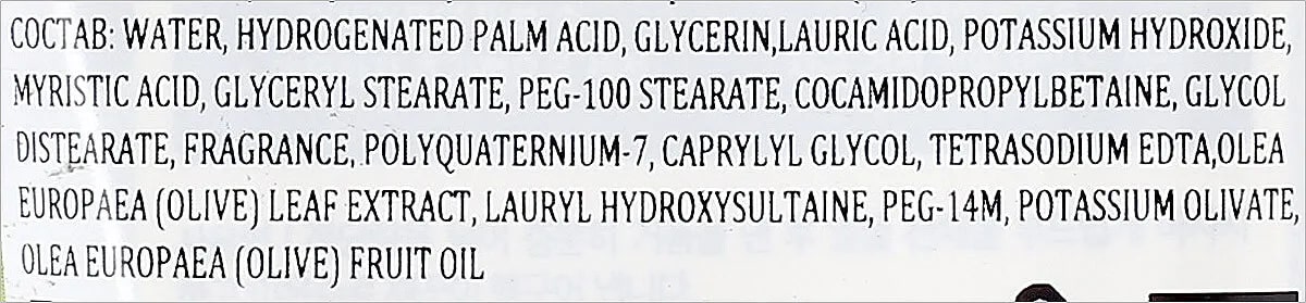 Water, Hydrogenated Palm Acid, Glycerin, Lauric Acid, Potassium Hydroxide, Myristic Acid, Glyceryl Stearate, Peg-100 Stearate, Cocamidopropyl Betaine, Glycol Distearate, Fragrance, Polyquaternium-7, Caprylyl Glycol, Tetrasodium Edta, Olea Europaea (Olive) Leaf Extract, Lauryl Hydroxysultaine, Peg-14M, Potassium Olivate, Olea Europaea (Olive) Fruit Oil.