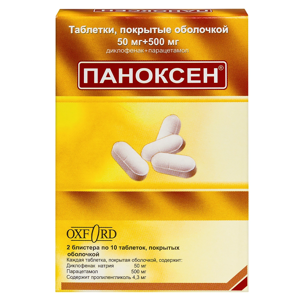 Паноксен® принимают внутрь, не разжевывая, во время или после еды, запивая небольшим количеством воды. По 1 таблетке 2-3 раза в сутки. Максимальная суточная доза - 3 таблетки (150 мг в пересчете на диклофенак).
