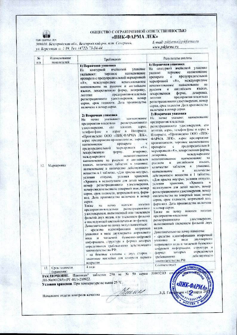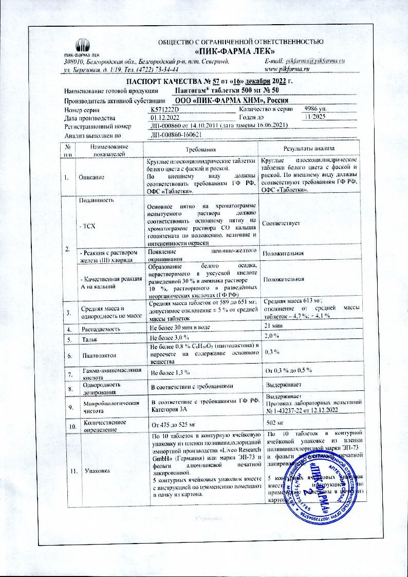 Действующее вещество: кальция гопантенат (Пантогам®, Кальциевая соль гопантеновой кислоты) 250 мг;