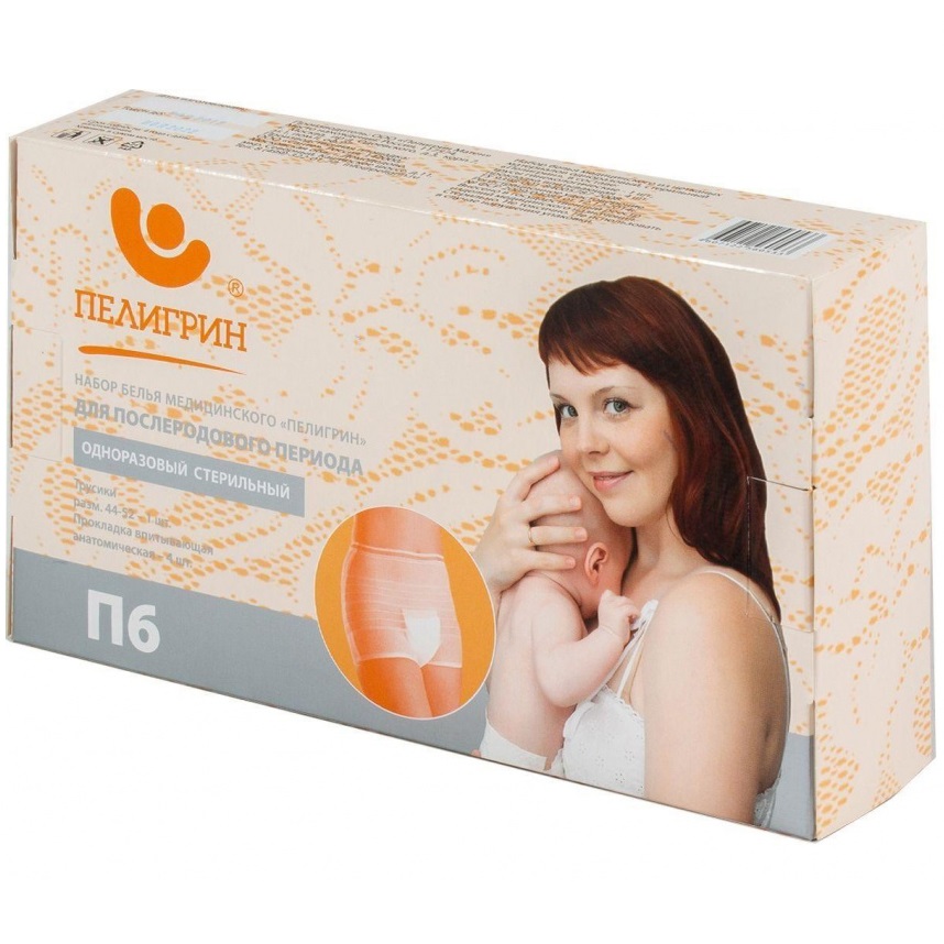 Эластичные сетчатые трусики используются для надежной фиксации прокладок. Обычные трусы не являются им достойной альтернативой, поскольку изделия «Пелигрин» сделаны из особой дышащей сетчатой ткани, которая плотно прилегает к телу, фиксируя прокладку, но при этом не раздражает швы, что способствует их скорейшему заживлению. Комплект стерилен, что обеспечивает дополнительную защиту от возможных инфекций и позволяет брать его с собой в роддом.