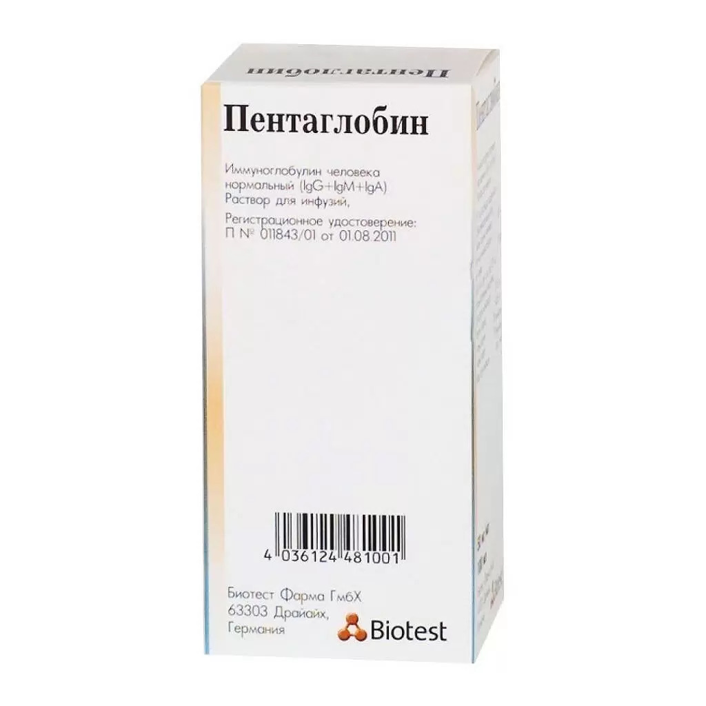 Пентаглобин содержит иммуноглобулин G (IgG) и повышенные концентрации иммуноглобулина A (IgA), и иммуноглобулина М (IgM) с широким спектром антител против возбудителей различных инфекций и их токсинов. Пентаглобин производят из пула плазмы крови более 1000 доноров. Из-за повышенного содержания IgA и в особенности IgM Пентаглобин имеет более высокий титр агглютинирующих антител против бактериальных антигенов, чем отличается от всех остальных стандартных иммуноглобулинов для инфузий. Соответствующие дозы Пентаглобина позволяют довести патологически низкую концентрацию иммуноглобулинов до нормального уровня.