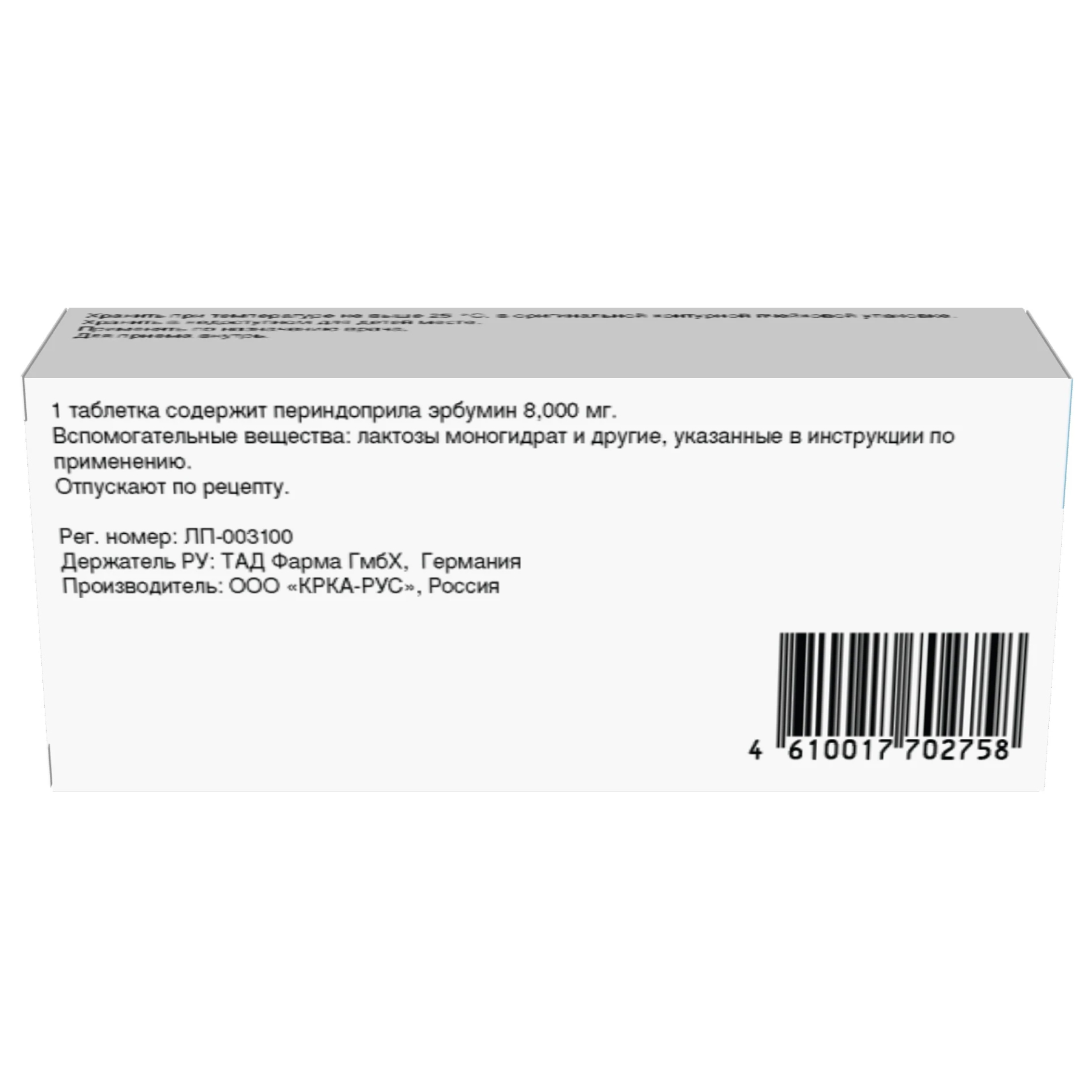 Действующее вещество:периндоприла эрбумин 8,000 мг