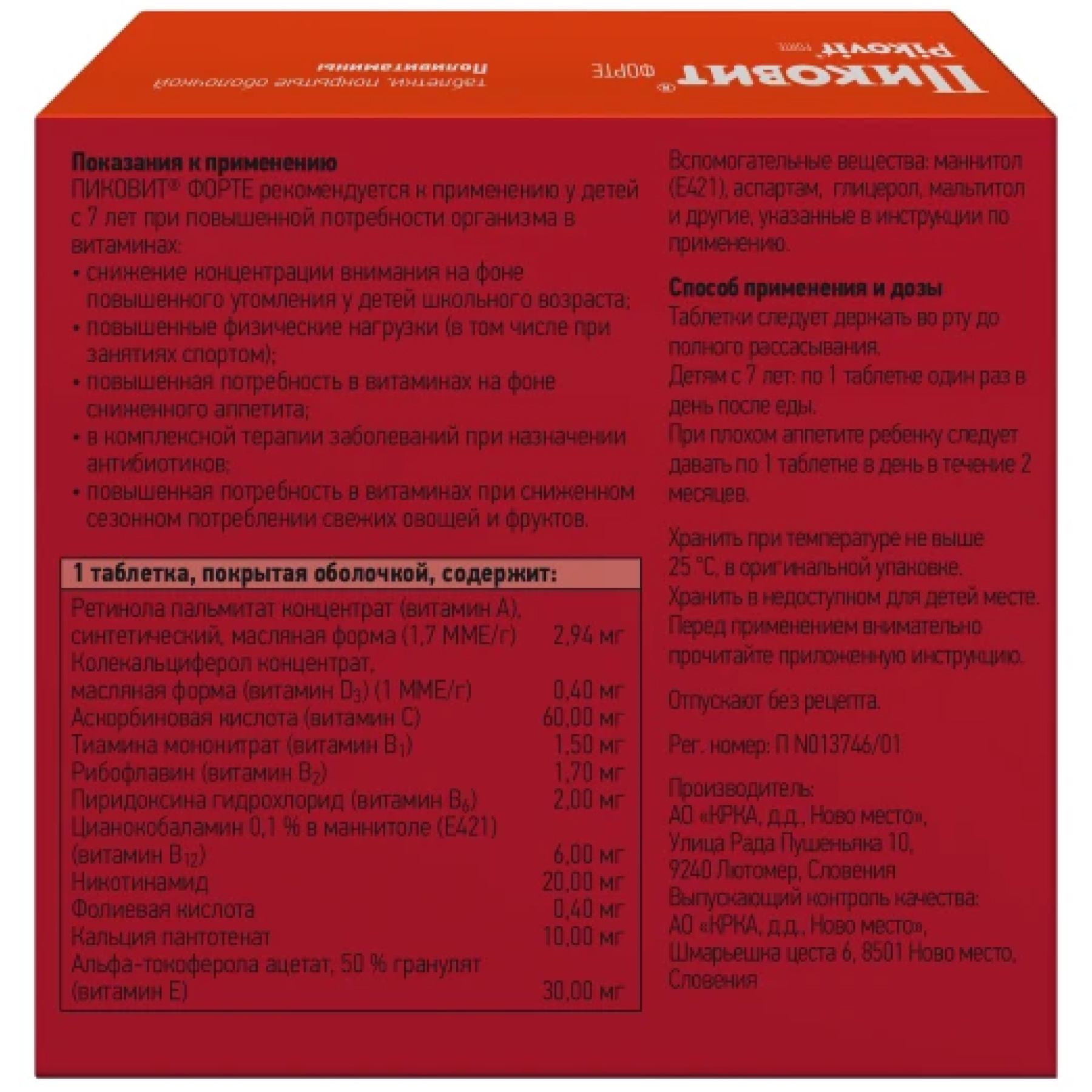 ПИКОВИТ® ФОРТЕ содержит 0,6 г малтитола, в связи с этим прием доз, превышающих рекомендуемые, может вызвать диарею.