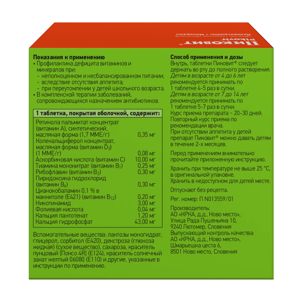Внутрь, таблетки Пиковит следует держать во рту до полного растворения.