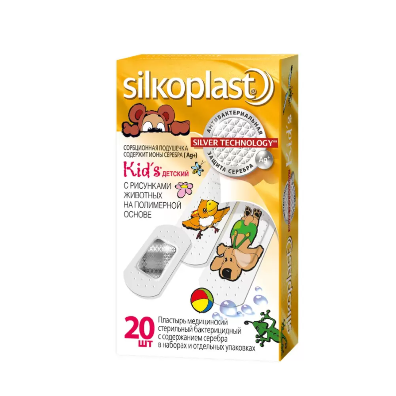Пластыри изготовлены из: тонкой микроперфорированной полимерной пленки телесного цвета с рисунками животных, покрытой гипоаллергенным клеем, сорбционная атравматичная бактерицидная подушечка пропитана серебром.