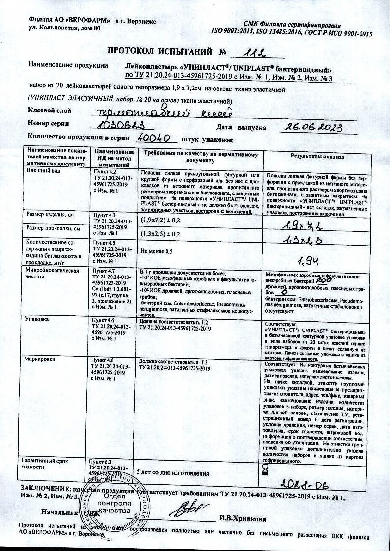 В качестве прокладки, прикрепленной к липкой основе, используется полотно двухслойное холстопрошивное медицинского назначения или полотно двухслойное атравматичное, или полотно нетканое термоскрепленное, или полотно нетканое, или медицинский нетканый материал, или нетканый материал, в качестве антисептического раствора используется раствор хлоргексидина биглюконата, в качестве защитного покрытия используется материал антиадгезионный или бумага силиконизированная, или пленка целлюлозная нелакированная, или пленка полиэтилентерефталатная.