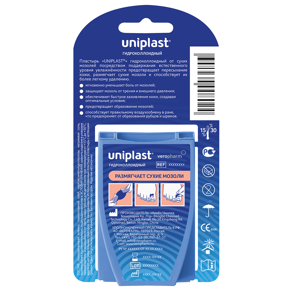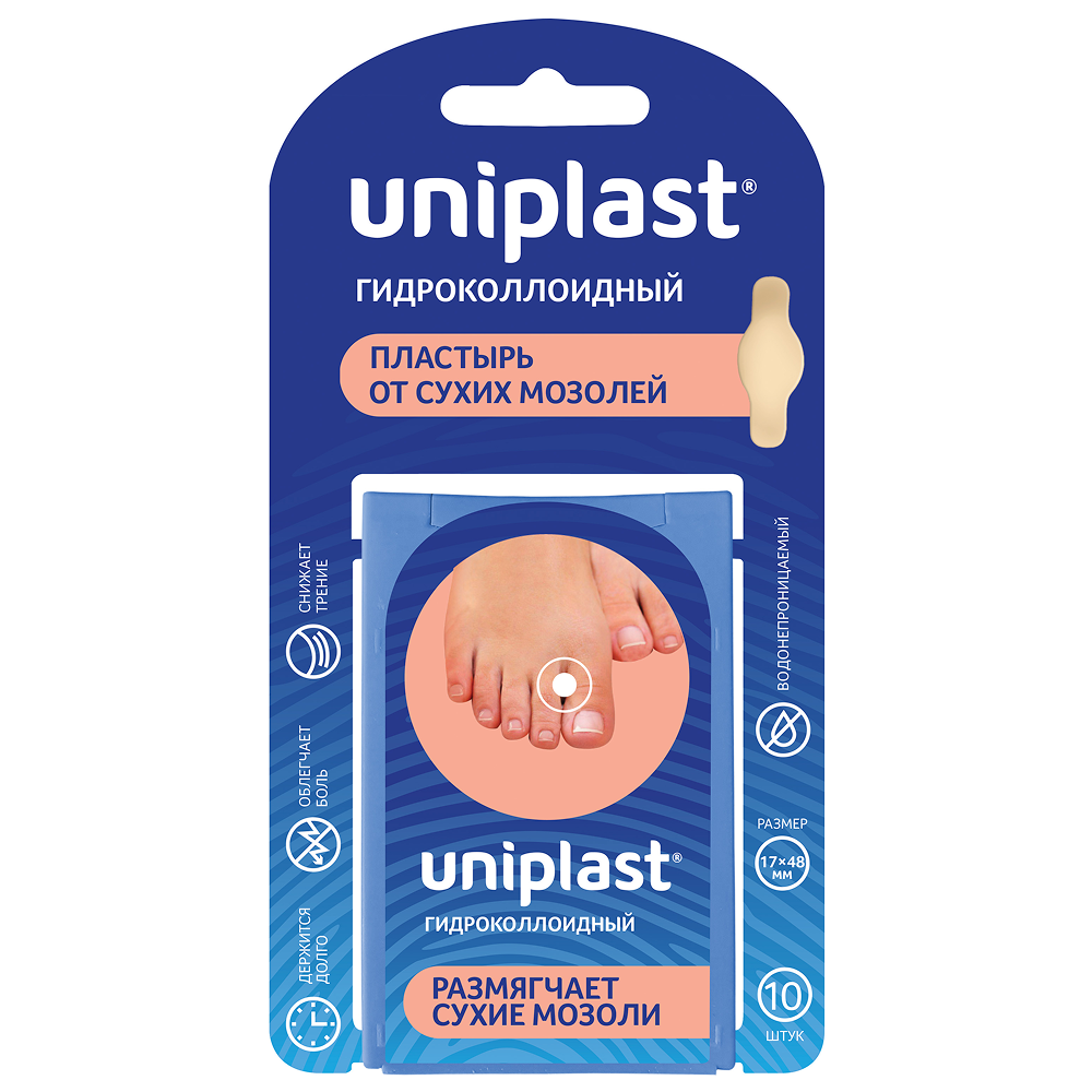 Пластырь UNIPLAST гидроколлоидный предназначен для эффективной защиты мозолей и натоптышей от загрязнения, намокания, воздействия внешней среды, бактерий, поддержания естественного уровня увлажнённости, адсорбции экссудата из мозолей, уменьшения боли, создания оптимальных условий для заживления, а также для предотвращения образования мозолей и натоптышей. Пластырь от сухих мозолей посредством поддержания естественного уровня увлажненности предотвращает пересыхание кожи, размягчает сухие мозоли и способствует их более легкому удалению.