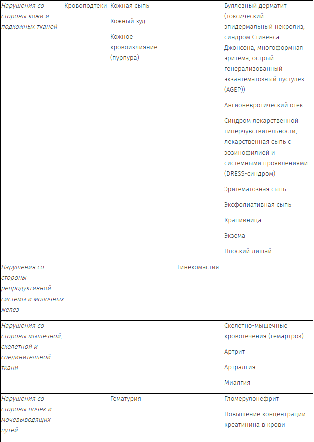 Нежелательные реакции, которые возникли во время клинических исследований или о которых сообщалось спонтанно, представлены в таблице ниже. Их частота определяется с использованием следующих условных обозначений: часто (от ≥1 / 100 до <1/10); нечасто (от ≥1/1 000 до < 1 /100); редко (от ≥1 / 10,000 до < 1 /1000); очень редко (<1/10 000); частота неизвестна (невозможно оценить по имеющимся данным). В каждом классе системно-органном классе нежелательные реакции представлены в порядке убывания серьезности.