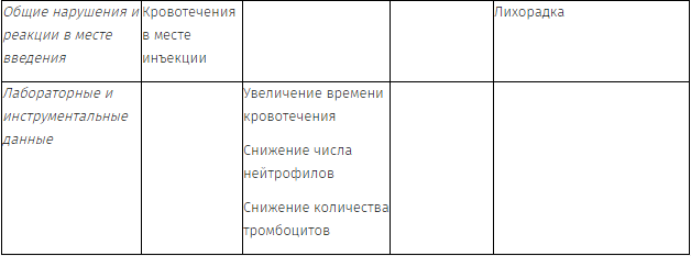 В связи с риском развития кровотечения и нежелательных явлений со стороны крови (см. раздел «Побочное действие») в случае появления в ходе лечения клинических симптомов, вероятно свидетельствующих о возникновении кровотечения, следует срочно сделать общий клинический анализ крови, определить активированное частичное тромбопластиновое время (АЧТВ), количество тромбоцитов, показатели функциональной активности тромбоцитов и провести другие необходимые исследования.