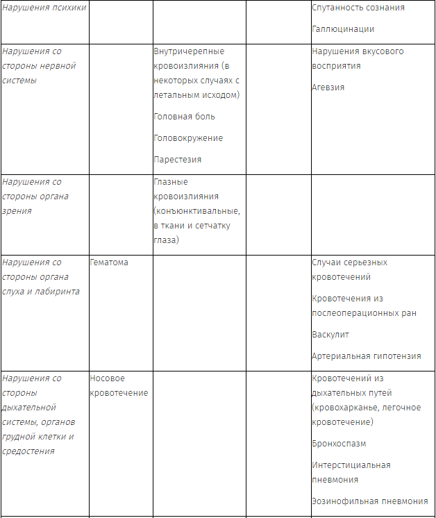 Кровотечение является наиболее частой реакцией, о которой сообщалось как в клинических исследованиях, так и при пострегистрационном применении. Чаще всего сообщалось о кровотечениях в течение первого месяца лечения.