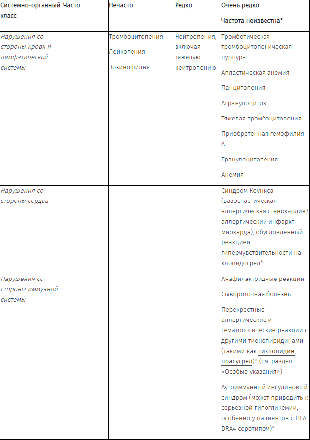 Частота возникновения тяжелой тромбоцитопении (< 80 • 109/л) составила 0,2 % у пациентов, принимавших клопидогрел и 0,1 % у пациентов, принимавших АСК, сообщалось об очень редких случаях снижения числа тромбоцитов ≤ 30 • 109/л.